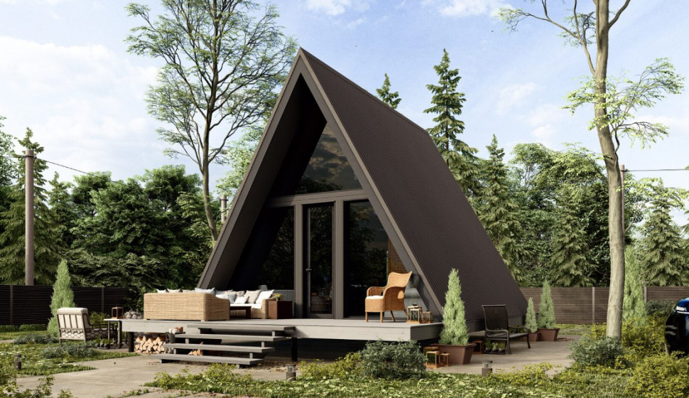 Максимально вариабельный проект A-frame дома. Может быть выполнен со входом и террасой спереди, или входом и террасой спереди и сзади. Внутренняя пространство также имеет два варианта планировки. Боковые фасады могут быть реализованы из Пир-панелей с металлическим покрытием, или из каркасных панелей с покрытием из профилированного листа в сочетании с планкеном хвойных пород. A-FRAME - современный и популярный вариант проектов, собираемые в лучших традициях скандинавских каркасных домов: без ОСБ/ОСП на укосинах, качественное утепление 200мм, профессиональные мембранные пленки, фасадные материалы заводской окраски, придающие шикарный внешний вид и долговечность. Дом, несмотря на скромные размеры 36 метров, имеет кухню-гостиную, спальный антресоль этаж и санузел. А фасад с полностью панорамным остеклением и выходом на террасу создает ощущение простора даже в таком небольшом пространстве.
