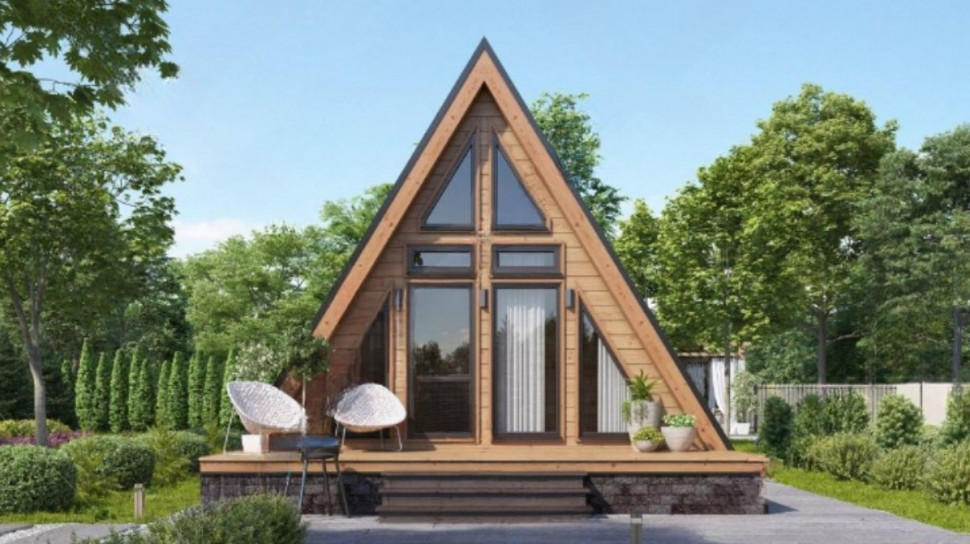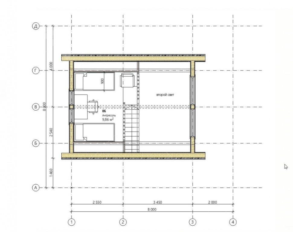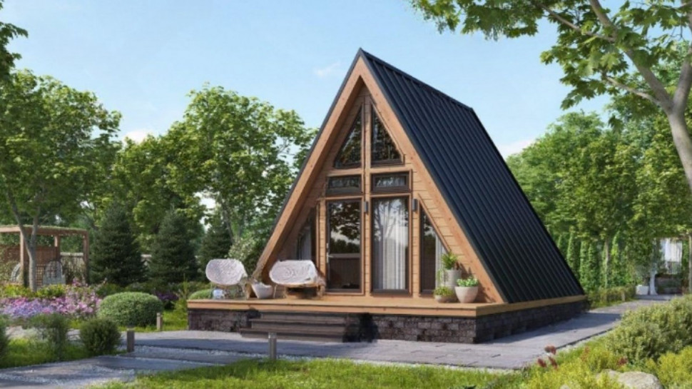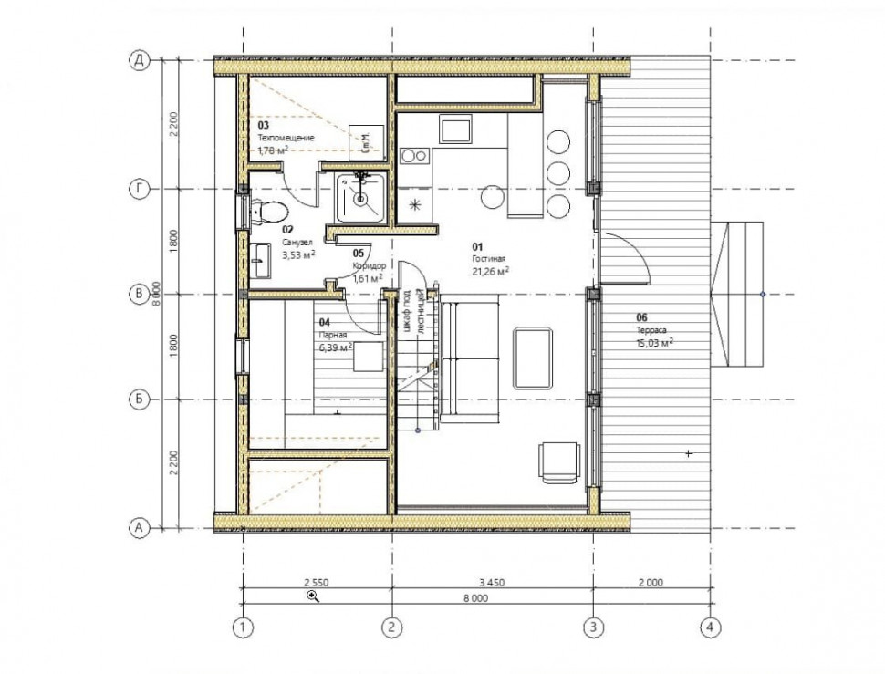 Проект каркасной бани в стиле А-фрейм, габариты 8 на 8 м, площадь 74 м. кв, второй этаж – антресоль. На первом этаже запроектированы гостиная-кухня 21,26 м2, санузел 3,5 метра, техническое помещение 1,8 м. Второй этаж типа антресоль со вторым светом – спальня 9,86 м2. Высота потолков первого этажа составляет 2,4 метра, а второго этажа (при его наличии) – 2,3 метра.