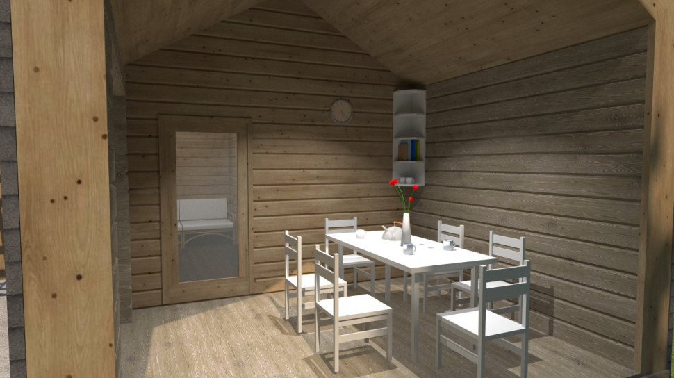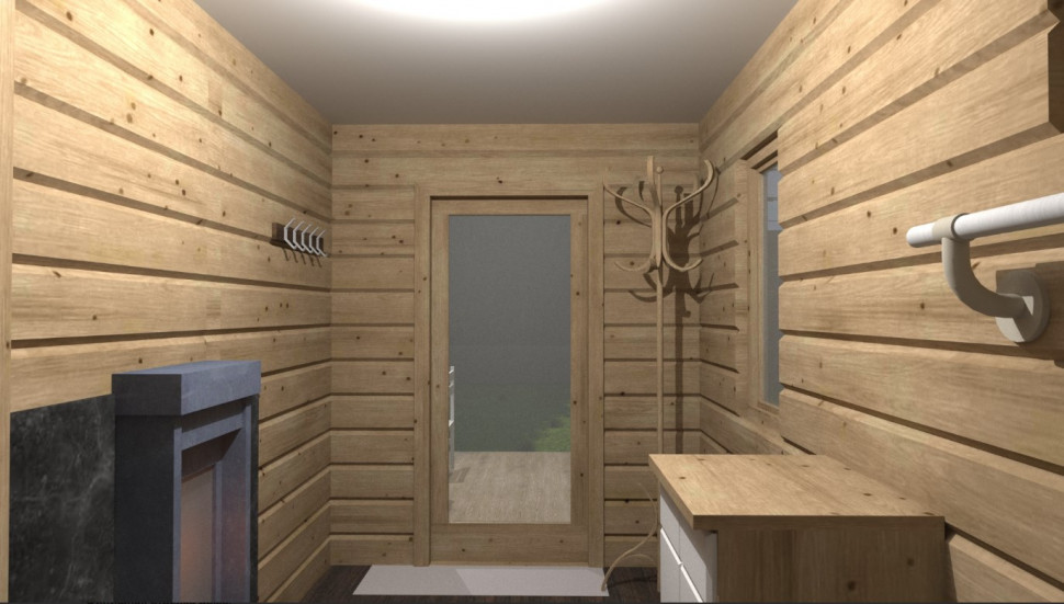 Баня разделена на 4 отделения: терраса (с двухсторонним входом) 10,2 м. кв, комната отдыха 7,22 м, помывочная 4,41 м, и парная 2,25 м.