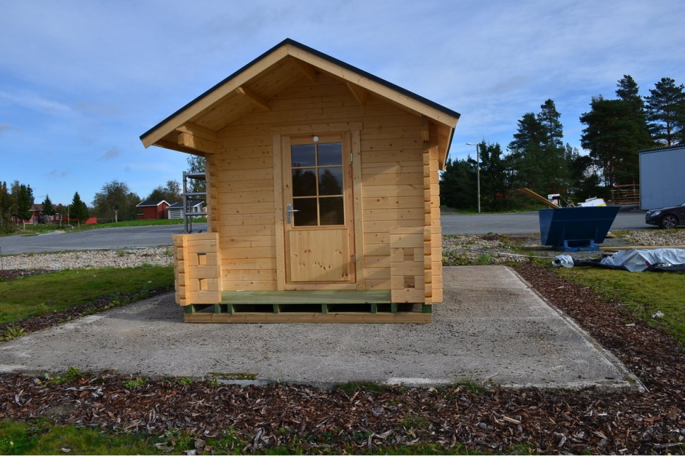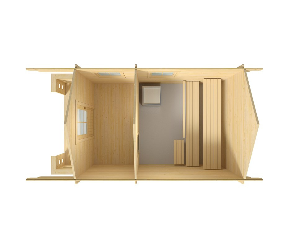Компактная баня из минибруса, общий размер 2.5 на 4.5 метра, 11 м2. Включает две секции: парилку - 2.5х2.4 м, и предбанник - 2.5х1.3 м. При входе обустроено маленькое крыльцо 2.5х0.8 метра. Баня мобильная, устанавливается без фундамента, на деревянной обвязке.