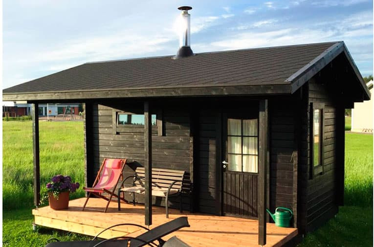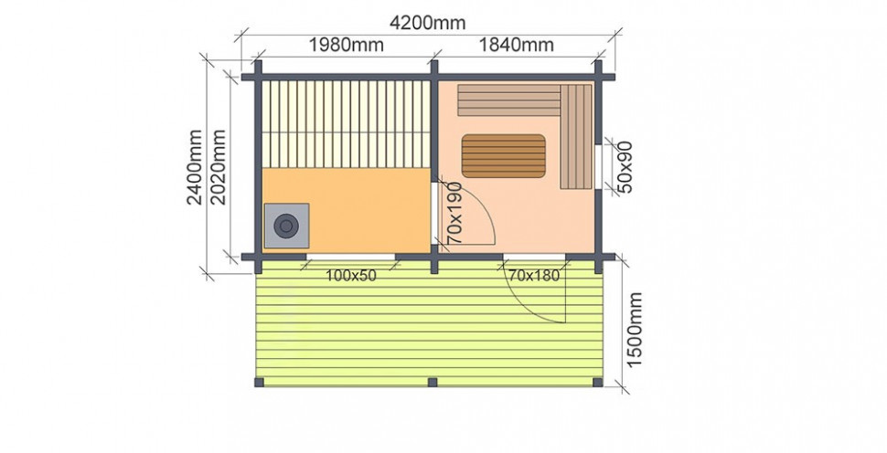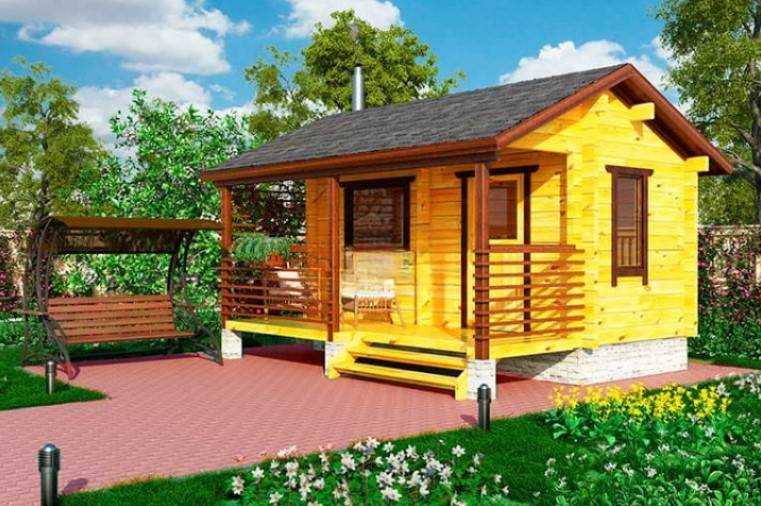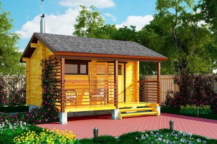 Проект небольшой, но уютной бани из минибруса, габаритные размеры 4,2 на 3,9 м (с террасой). Внутри два отделения: парная 2 на 2 метра (4 м2), и комната отдыха – 1,8 на 2 (3,6 м2). Компактность внутренних помещений компенсируется относительно просторной террасой 4 на 1,5 (6 м2). Где можно расположится в теплое время года. Основной материал – минибрус из хвойных пород сечением 145х65 мм. Возможные разные варианты отделки (смотрите на фото), и комплектации оконными и дверными блоками.