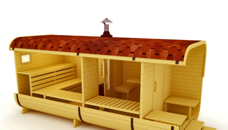 Баня квадратной формы (квадро-бочка) с закругленными углами. Общий размер: длинна 4,7 метра, ширина - 2,1 метра. Парилка - 2,2 м, комната отдыха – 1,5 м, крыльцо с лавками для сидения – 70 см. Стены из профилированного бруса 44 мм толщиной. Материал по заказу, кедр или ель. Сверху покрыта битумной черепицей. Устанавливается краном или собирается по месту на легком блочной фундаменте и деревянных подставках.