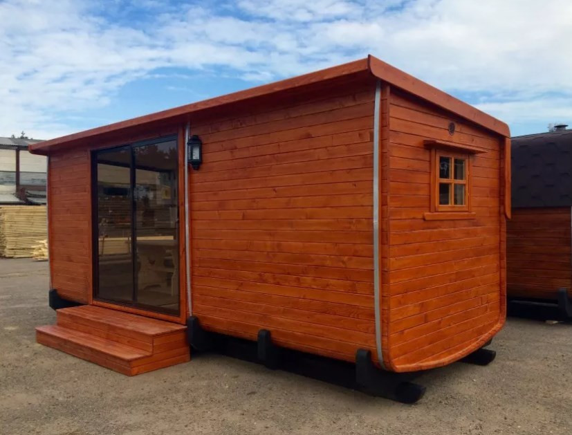 Баня Парус размером 6,0 на 2,4 метра, из двух отделений: комната отдыха и парная. Выполнена в современном практичном стиле, с большим окном и панорамной дверью под стекло в комнате для отдыха. Комната отдыха может быть укомплектована столом, лавками, полками, минибаром, прочими атрибутами. В летнее время ее можно использовать и как обычную беседку для отдыха.
