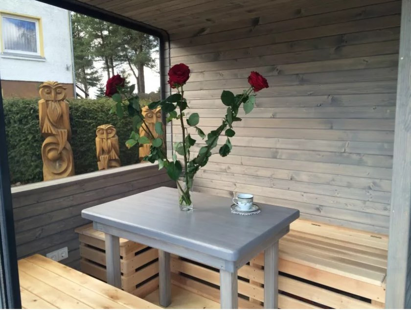 В холле есть стол и скамейки, на которые удобно складывать вещи и дрова.