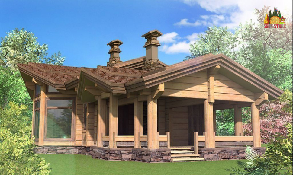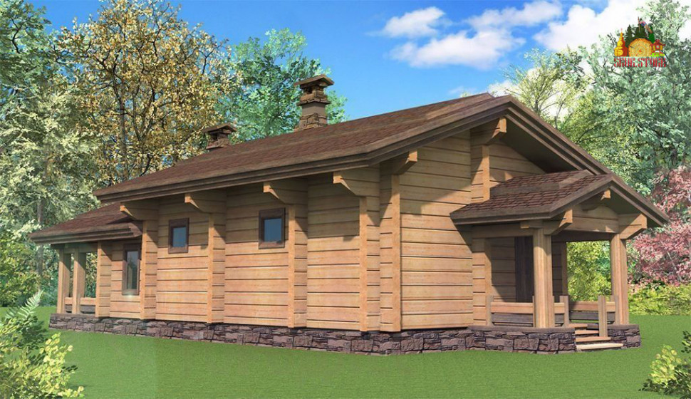 Проект бани с большими панорамными окнами, общая площадь - 95 м2, площадь внутренних помещений - 65м2, терраса-барбекю – 30 м2. Внутри бани размещаются: гостиная – 23,3 м2, кухня – 5,2 м2, душевая – 7,8 м2, хаммам – 6,3 м2, парная – 9,5 м2, санузел – 1,9 м2, топочня, крыльцо и тамбур.