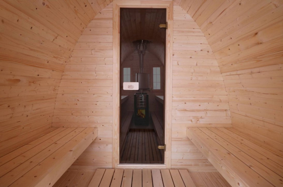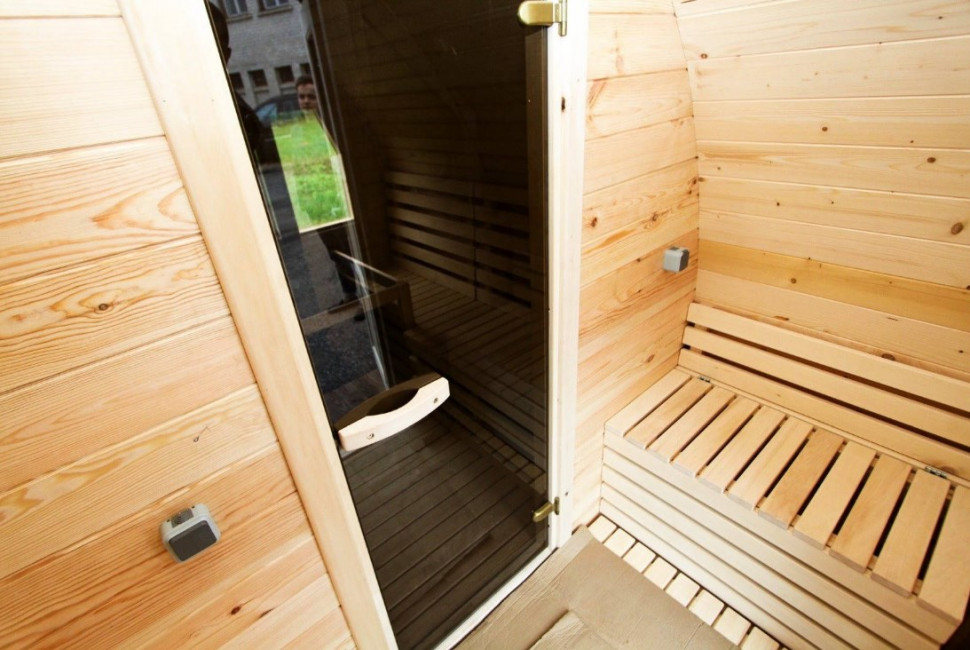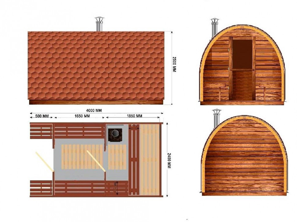 Поставляется в собранном виде, включая: покраску, кровлю, двери и окна, термозащиту, полки, подспинники и трапы, стулья на террасе.