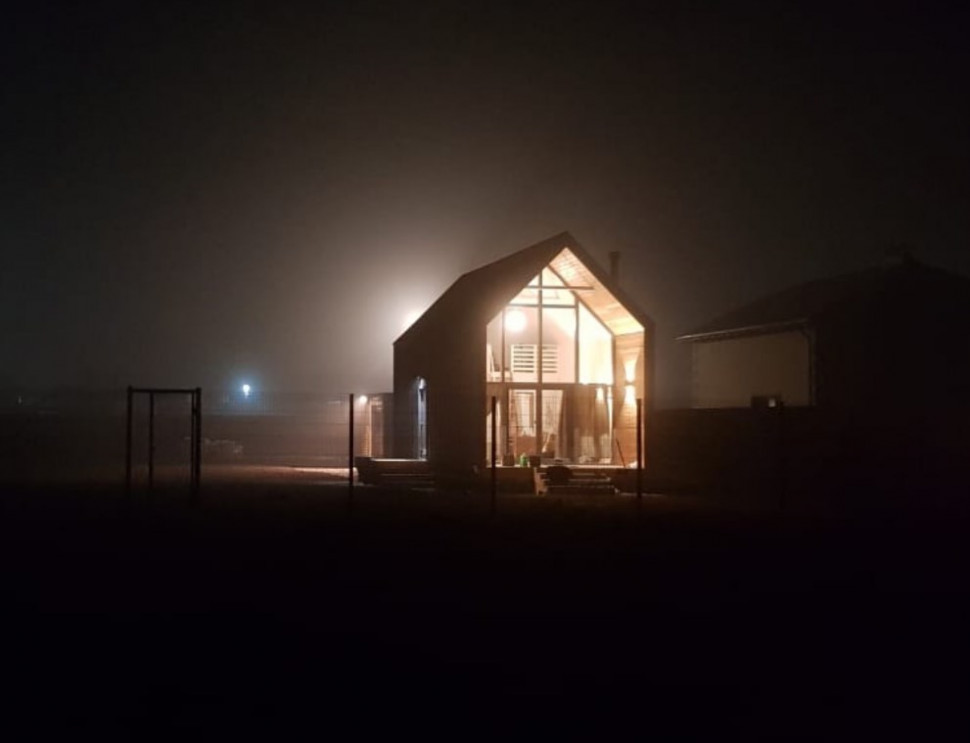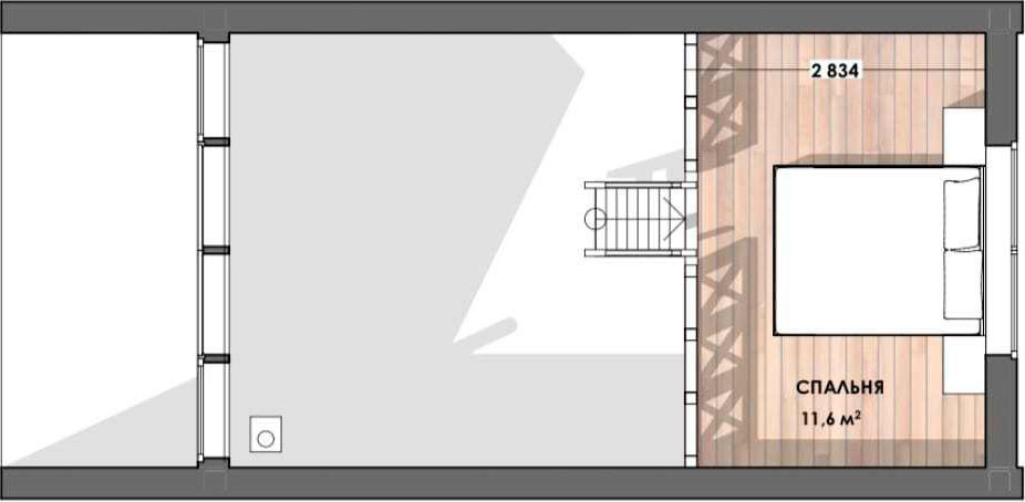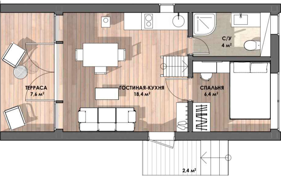 Проект компактного дома в стиле Барн Хаус полтора этажа (второй антресольный), с вторым светом и крытой террасой со стороны фасада. Наружные размеры 4,85 х 9,6 м, площадь (без учета террасы) 52 м2. На первом этажа расположена гостиная-кухня 18,4 м2, спальня 6,4 м2 и совмещенный санузел 4 м2. На втором антресольном этаже вторая спальня 11,6 м2. Со стороны фасада обустроена крытая терраса 7,6 м2. Дом на два входа, с фасада и с правой боковой стороны. Панорамное остекление фасада во всю площадь стены, переходящее в так называемый «второй свет» для антресольного этажа. Рассчитан на круглогодичное проживание 3-4 человек.