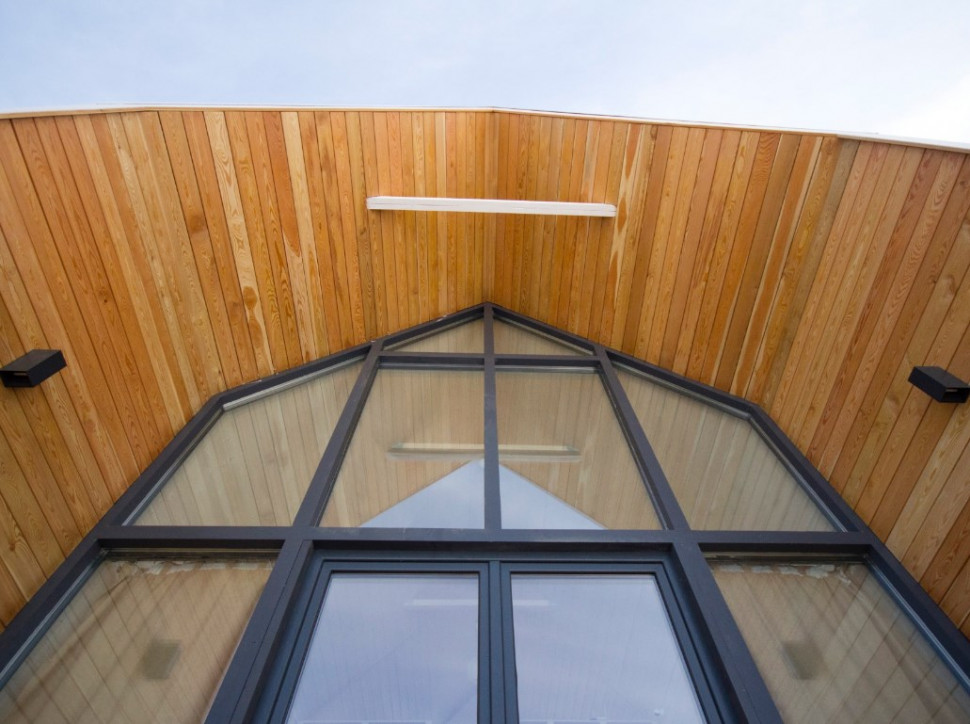 Отделка кровли и боковых стен металлопрофилем. Цвет RAL 7024 или аналогичный. Отделка переднего и заднего фронтона: Планкен из лиственницы сорта AB 120х20 и 140х20. Без покрытия пропиткой — под старение. Полы террасы: террасная доска (28 мм) из лиственницы с покрытием прозрачным маслом в 2 слоя. Освещение веранды и зоны входа: Влагозащищенные диодные светильники на террасах. Влагозащищенные розетки.