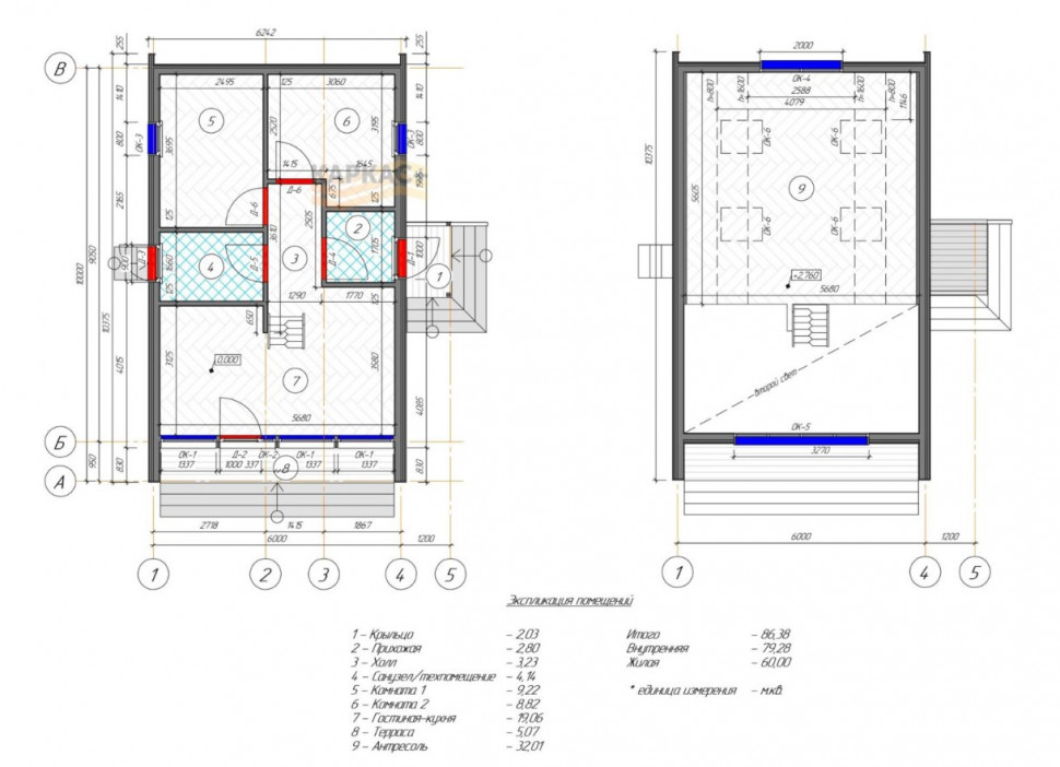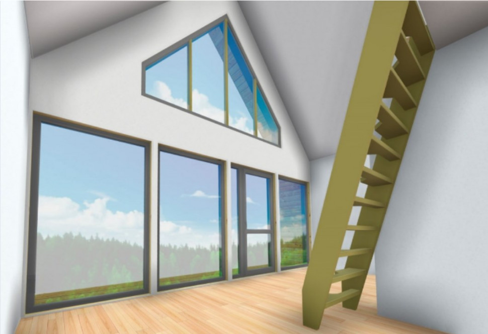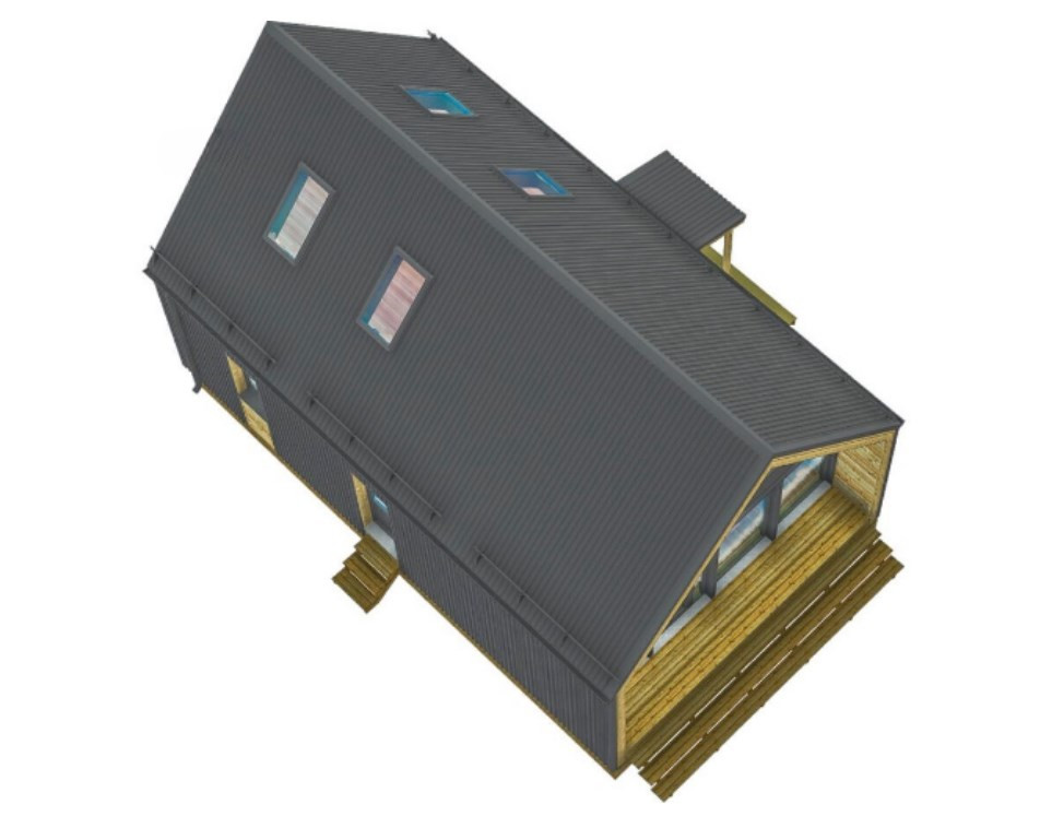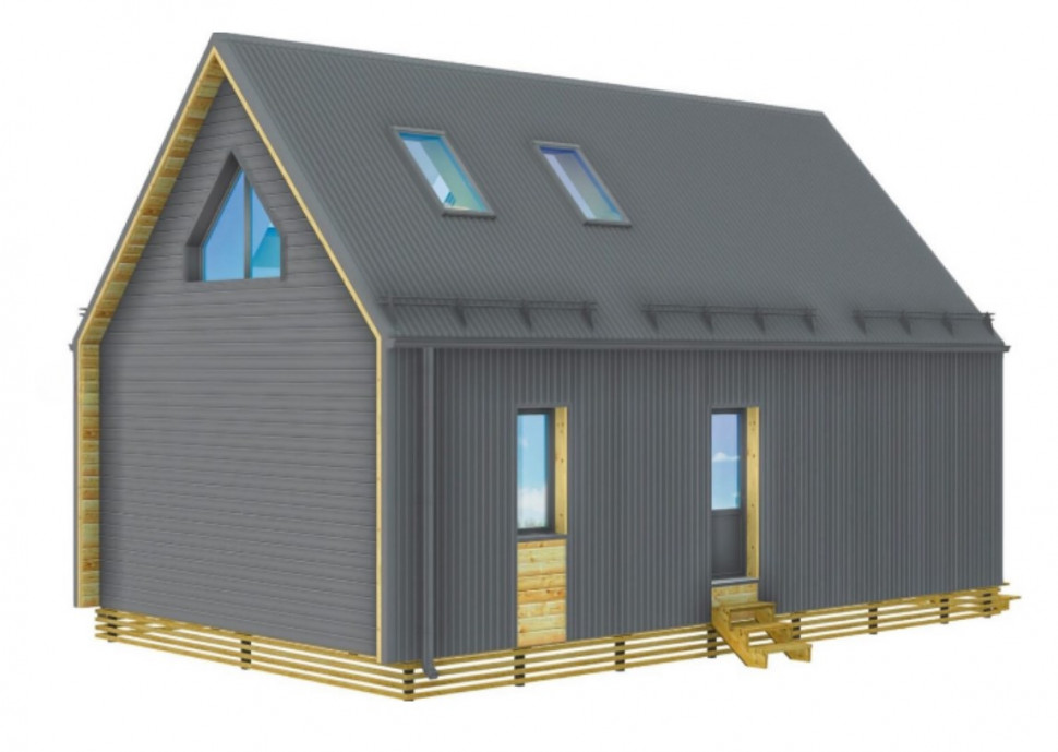 Дом в стиле Барнхаус "Barn House" полтора этажа (второй свет) с тремя комнатами для постоянного проживания. Размеры 6 на 10 м, площадь 87 м2, жилая – 60 м2. На первом этаже кухня-гостиная 19 м2, две комнаты 9,2 и 8,8 м2, санузел 4,14 м, холл 3,2 м. На втором антресоль (второй свет) 32 м2 под свободную планировку. Дом на два входа, с фасада, через небольшую (5 м2) террасу, и боковой. Фасад под панорамное остекление.