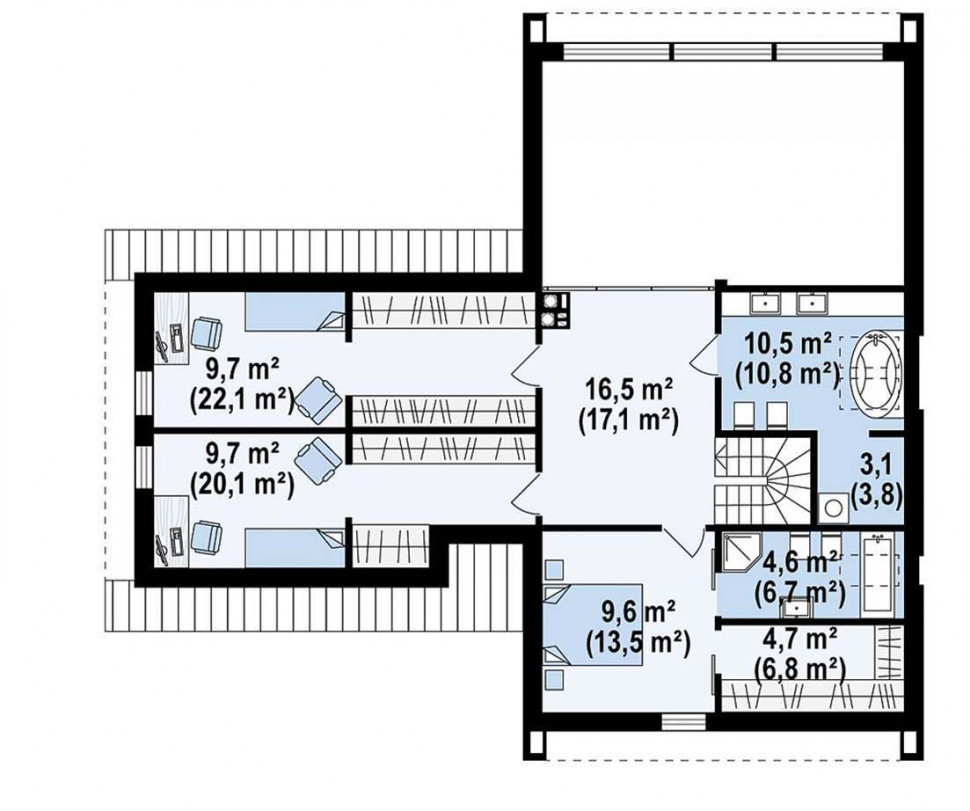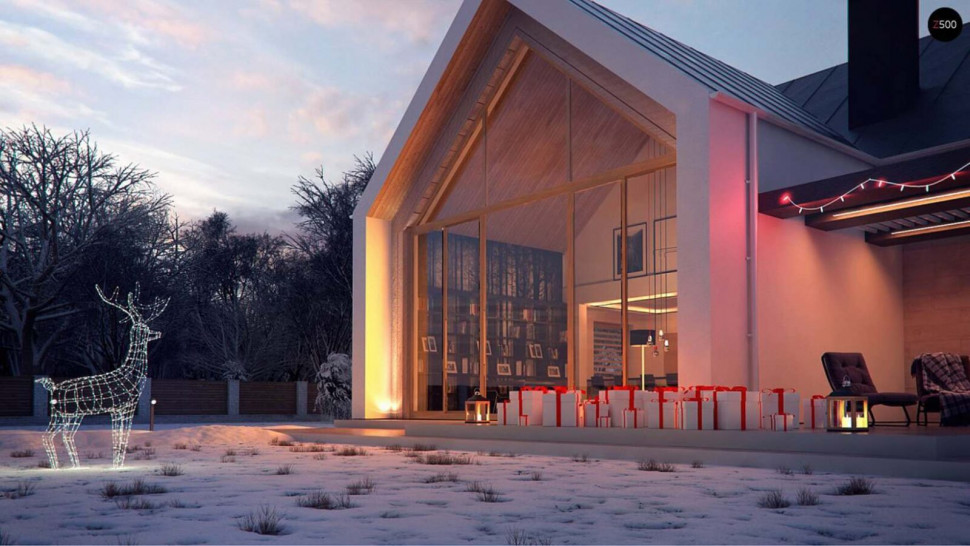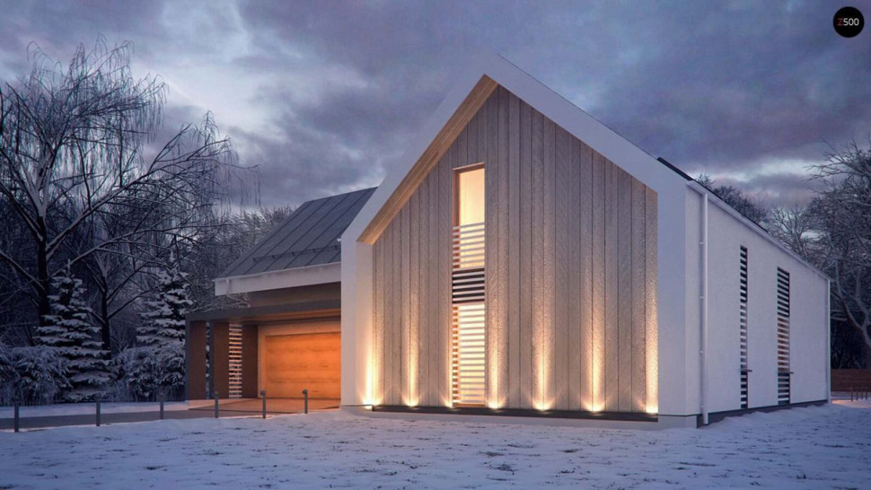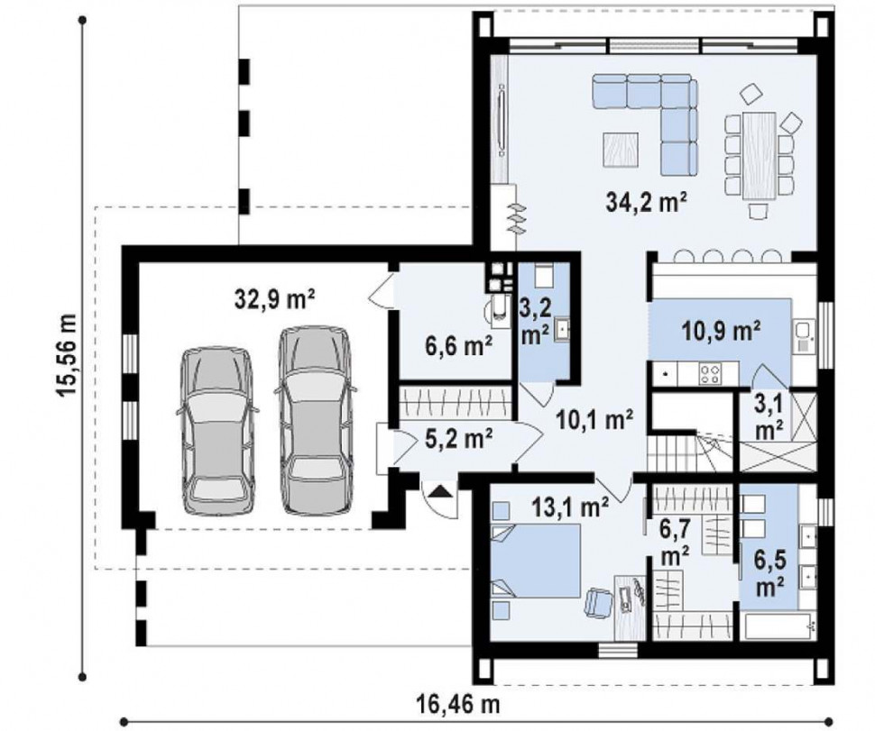 Проект большого двухэтажного (второй свет) дома в стиле БарнХаус ля постоянного проживания. Общие размеры строения 16,5 на 15,6 м, площадь 235 м2, в доме 5 комнат, 2 санузла и большой гараж на 2 машины. На первом этажа размещены гостиная 34,2 м2, кухня 14 м, спальня 13,1 м, санузел 6,5 м, гараж 32,9 м, подсобные помещения. На втором три спальни 22, 20 и 13,5 метра, плюс холл и санузел.