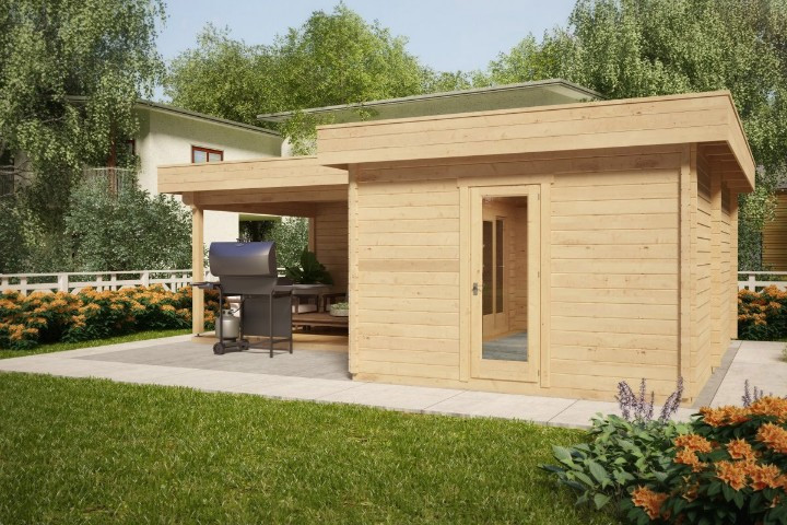 Беседка имеет необычную угловую форму и представляет собой две раздельные зоны, открытую и закрытую. В открытой можно разместить столики и гриль, в закрытой - кухню.