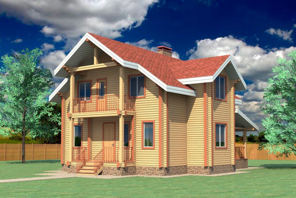 Это уникальный проект для тех, кому нравится современная изысканность и стиль. Дом имеет сложную многоскатную крышу, а в его архитектуру гармонично вписываются крыльцо и открытая лоджия, украшенные балясинами. Общая площадь постройки 141,92 м². Пятно застройки 11,1 х 8 метров. Изюминкой проектного решения является большая терраса, площадью 22.2 м², а также небольшой, но уютный балкончик на втором этаже, соединяющий спальные комнаты. Такая постройка подойдёт для постоянного проживания небольшой семьи из 3-4 человек.