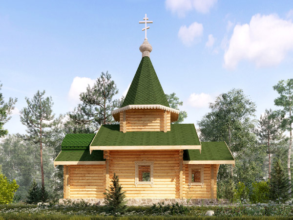 Часовня из бревна (36,9 м²) отличается лаконичными линиями и красивым ансамблем крыш. Внимание привлекает высокая шатровая крыша, увенчанная куполом. Контраст светлых стен и насыщенного цвета кровли делает здание очень нарядным.