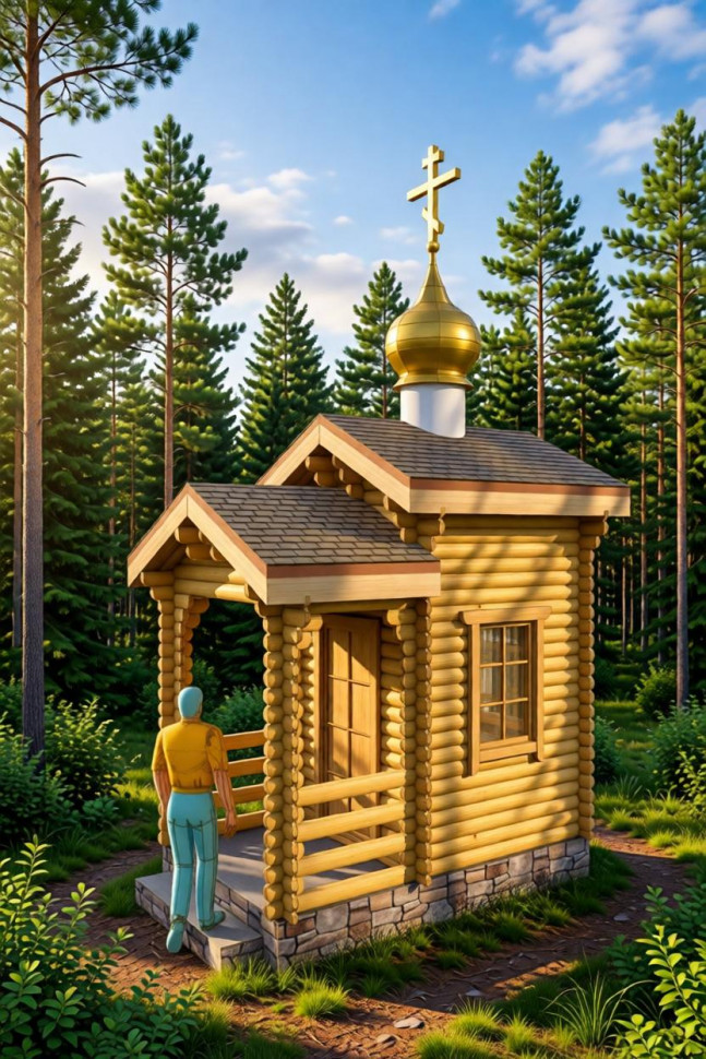 Представляемая к продаже модель часовни из минибруса, представляет собой законченное архитектурное сооружение культового назначения, изготовленное по технологии сборки из профилированного минибруса камерной сушки. Конструкция имеет в плане форму квадрата, что является классическим решением для малых архитектурных форм данного типа.