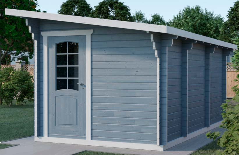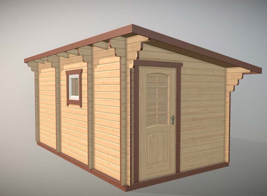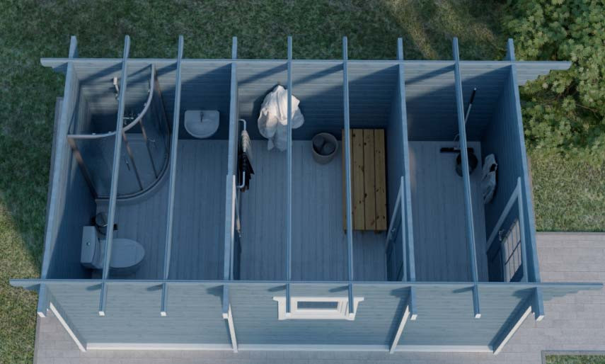 Полноценный санузел для дачи или частного дома, 2,5 на 5 метров. Состоит из трех секций: прихожая – 4,4 м2, раздевалка – 4,5 м2, совмещенный туалет с душевой кабиной – 3 м2. Стены из сухого минибруса хвойных пород (сосна или ель), 44 мм толщиной. Пол – строганая половая доска 35 мм, уложенная на лаги 50х100 мм. Крыша односкатная, покрыта битумной черепицей. Устанавливается на блочный фундамент с обвязкой из деревянного бурса. Входная дверь деревянная, под стекло. Внутренние – глухие. Окно 60х50 см. Наружная отделка может быть прозрачная, с прокраской торцов минибруса. Или под краску, в выбранный вами цвет. Собирается за два дня.