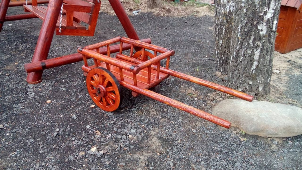 На изображения представлены два варианта декоративной телеги – большая четырехколесная, и полутелега (повозка на двух колесах). Цена указана за полутелегу. Подойдет для создания тематической композиции в сельском стиле, на приусадебном участке, в парковой и иных зонах отдыха. Отделка выполнена с сохранением естественного цвета древесины, но можно сделать темную, или брашированную, состарить.