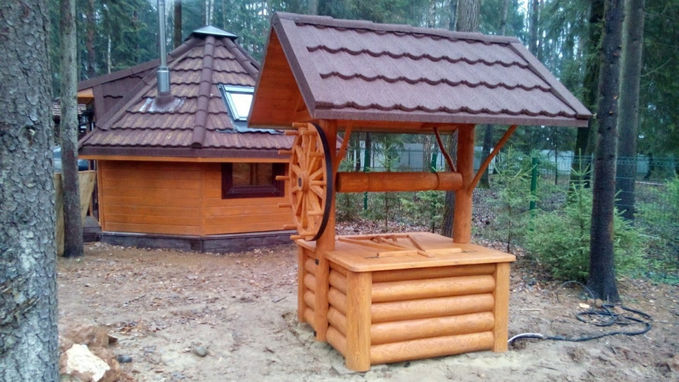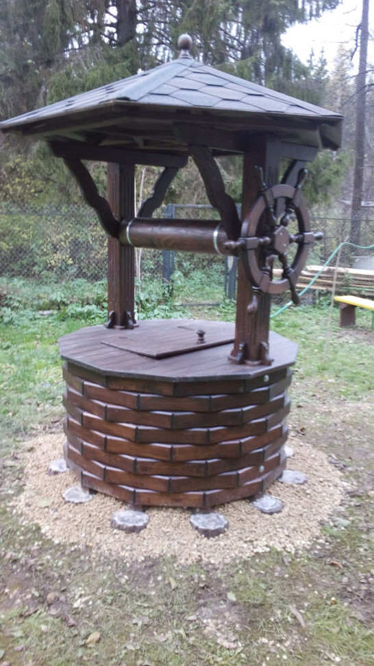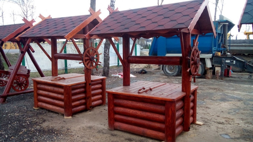 На изображениях представлены несколько вариантов деревянных «домиков» для колодца. Могут использоваться как оголовки настоящего (функционирующего) колодца, так и в качестве декоративного элемента в тематической композиции. Для обустройства приусадебных участков, парковых территорий, оформления мест отдыха в сельском стиле. Колодцы могут быть выполнены округлой формы, из бруса. Или как вариант прямоугольного сруба. С разными типами отделки.