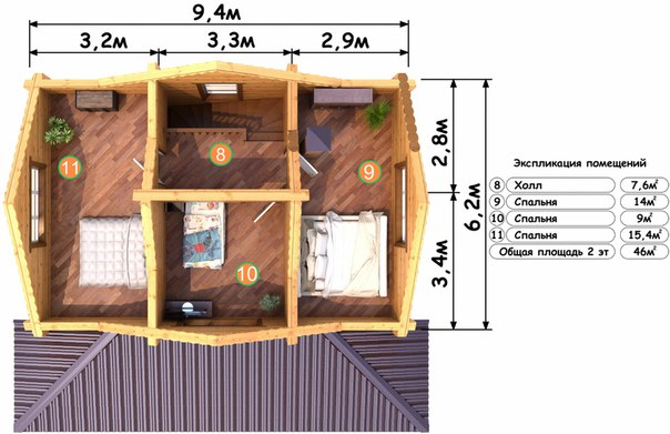 Дом из бревна 8,4х9,4 м (108,8 кв. м) 1,5 уровня. При входе есть удобная для отдыха терраса 11,9 кв. м. На первом этаже расположена просторная гостиная 22,7 кв. м., кухонная зона 6,4 кв. м., компактная прихожая 3,3 кв. м. Есть возможность попариться в парной 5,8 кв. м., рядом расположена душевая 4,4 кв. м., сан. узел 8, 3 кв. м. Общая площадь составляет 62,8 кв. м. На втором уровне располагаются три спальные комнаты площадью 9 кв. м., 15, 4 кв. м., 14 кв. м. соответственно и холл 7,6 кв. м. Общая площадь составляет 46,0 кв. м.