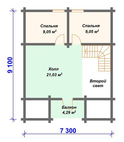 Дом из бревна 8,7х9,1 (105 кв. м). Дом 1,5 уровня, площадью 105 м2 из безопасного, огнестойкого оцилиндрованного бревна. Диаметр бревен 22 см, длинна 9,1 м, ширина 8,7 м. На первом уровне по проекту расположены следующие помещения: гостиная 22,92 м2, спальня 9,05 м2, кухня 5,11 м2, холл 3,65 м2, топочная 4,03 м2, сан. узел 3,80 м2, терраса 10,80 м2, крыльцо 2,52 м2.