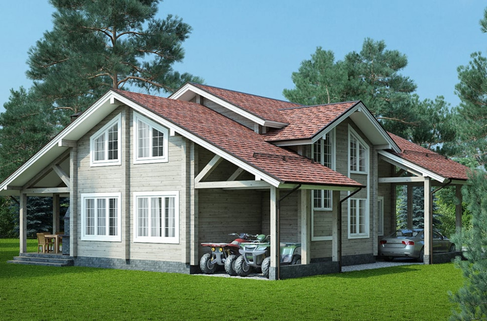 Стильный и современный домик из клеёного бруса, выполненный стиле альпийское шале. В проекте постройки предусмотрен один навес для автомобиля и один для менее габаритных транспортных средств — мотоциклов, квадроциклов, велосипедов и т. д. Размеры застройки 14,695 х 14,95 метров. На крыльцо и веранду приходится 56,54 м². Внутри дома предусмотрены ключевые технические помещения и все необходимые функциональные зоны для комфортного постоянного проживания большой семьи из 6-10 человек.