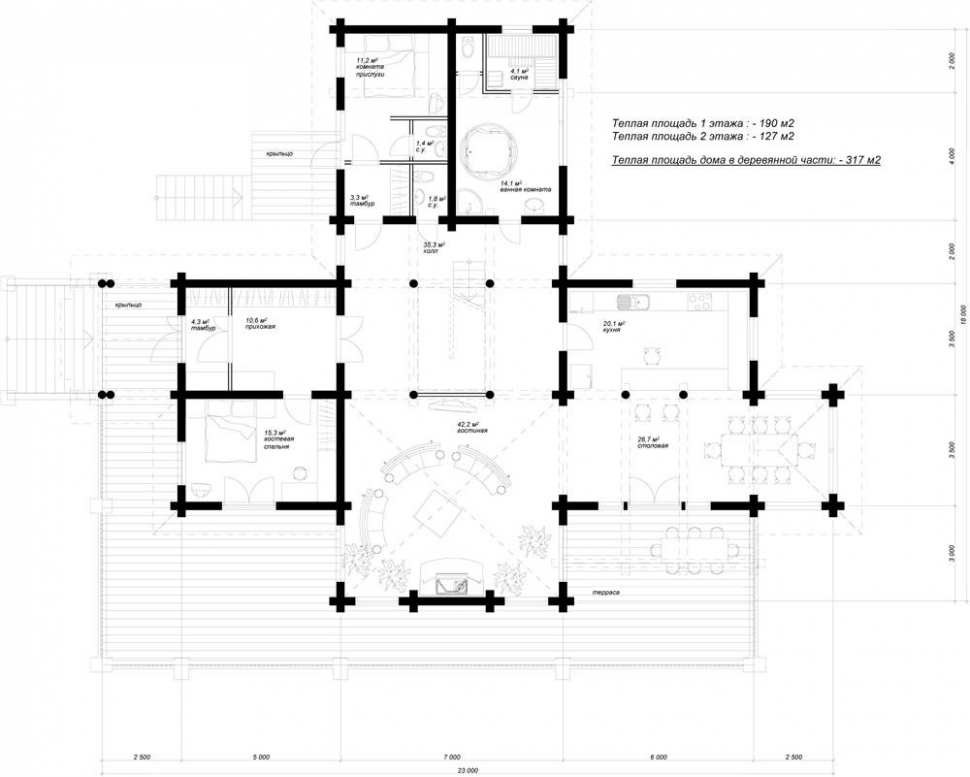 Двухэтажный дом из рубленного бревна (сосна) 414 кв.м, можно заказать воспользовавшись формой на сайте или связавшись с нашим менеджером по телефону +7 (499) 677-52-28. Мы предлагаем бесплатный выезд на замер и консультации, живое портфолио, квалифицированные бригады по три-четыре человека, более 1300 выполненных объектов, большинство новых клиентов приходят по рекомендации. Любой из проектов «Srub.Store» может быть дополнен или изменить по вашему желанию.