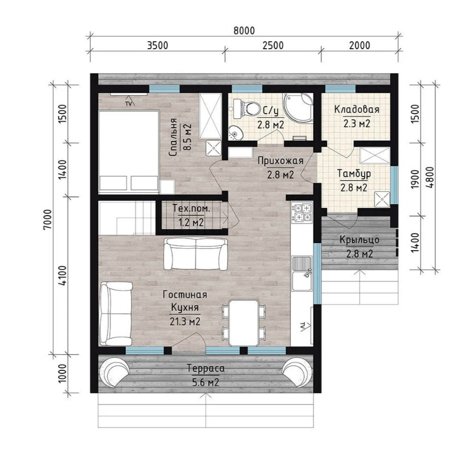 Проект двухэтажного дома в стиле БарнХаус с тамбуром, размеры 8 на7 м, площадь 91 м2. На первом этаже кухня-гостиная 21,3 м, спальня 8,5 м, санузел 2,8 м, прихожая, техническое помещение, кладовая и тамбур. На втором холл 5,1 м, две спальни 8,5 и 14,8м, второй санузел 2.8 метра.