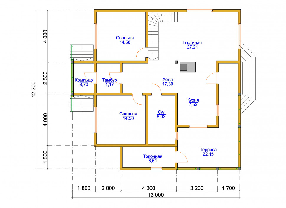 Проект жилого двухэтажного дома с террасой 13х12,3 м, в первом этаже две спальни, гостиная кухня, санузел и хозпомещения. Во втором мансардном – три спальни, бильярдная, холл и второй санузел. Стены собраны из профилированного бруса естественной влажности. Сечение – по желанию заказчика. Проект разработан для следующих климатических условий: расчетная температура наружного воздуха - 29º, ветровой напор - 23кг/м2, расчетное значение веса снегового покрова - 240кг/м2, сейсмичность участка - до 6 баллов. Степень огнестойкости здания - V.
