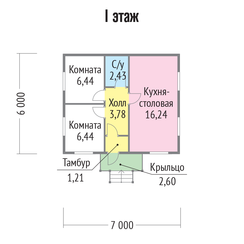 Одноэтажный дачный каркасный дом (7×6 м, 36,5 м²) рассчитан на семью из 2—4 человек. Из небольшого холла в центре дома двери ведут в кухню, две комнаты (маленькие спальни по 6,4 м²) и санузел. Кухня совмещена с обеденной зоной и часто играет роль гостиной. Каркасные дома строятся быстро.