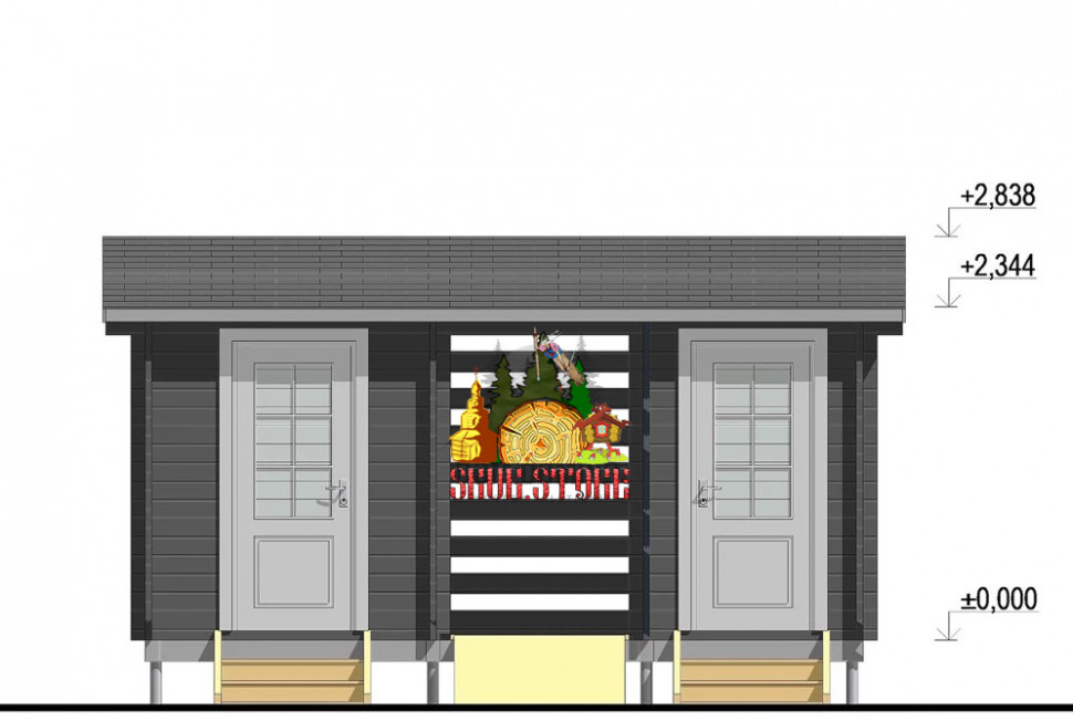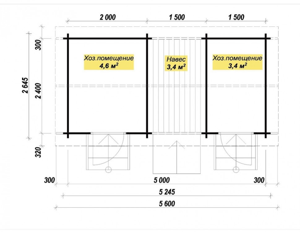 Проект хозяйственного блока для дачи или частного дома с дровяником. Наружные размеры 2.6 на 5.6м, площадь 13.4 м. кв. Два раздельных хоз помещения с отдельными входами: 4,6 и 3,4 м. кв. Дровник – 3,4 м.кв. Легкая быстровозводимая конструкция из минибруса 45х145 мм. Кровельное покрытие – гибкая черепица. Собирается на блочном фундаменте. Двери филенчатые, из массива сосны, полотна 2000х800 мм. Доступны разные варианты отделки (смотрите на изображениях).