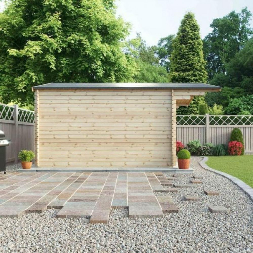 От постройки отходит выступающая кровля под которой можно разместить стол и стулья для уютных вечерних посиделок с друзьями. Дом комплектуется широкими двустворчатыми распашными дверями со стеклянными вставками, поэтому внутрь можно заносить даже крупногабаритную мебель. Домокомплект полностью готов к сборке своими руками.