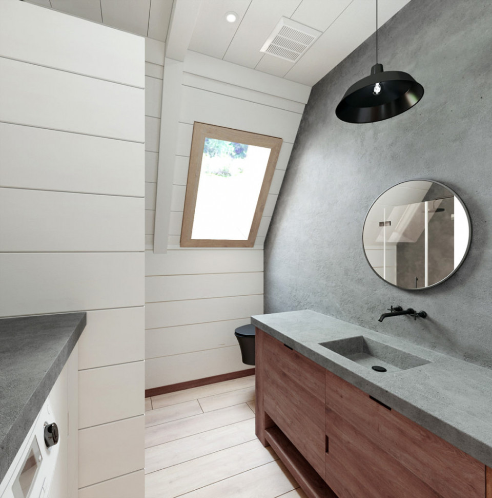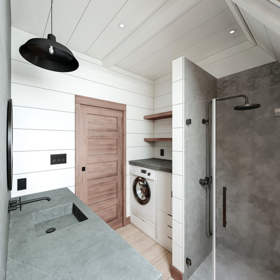 Проект дома в двух уровнях с четырьмя жилыми комнатами и мансардой идеально подойдет для круглогодичного проживания. На первом этаже размещается просторная кухня гостиная, две комнаты и санузел, в мансардном этаже – еще одна комната-спальня. Печка придает неповторимый колорит и атмосферу, а окно на крыше дает дополнительное освещение в доме. С фасада к дому прилегает большая открытая терраса для отдыха в теплое время года. С тыльной стороны, на втором этажа обустроен балкон.