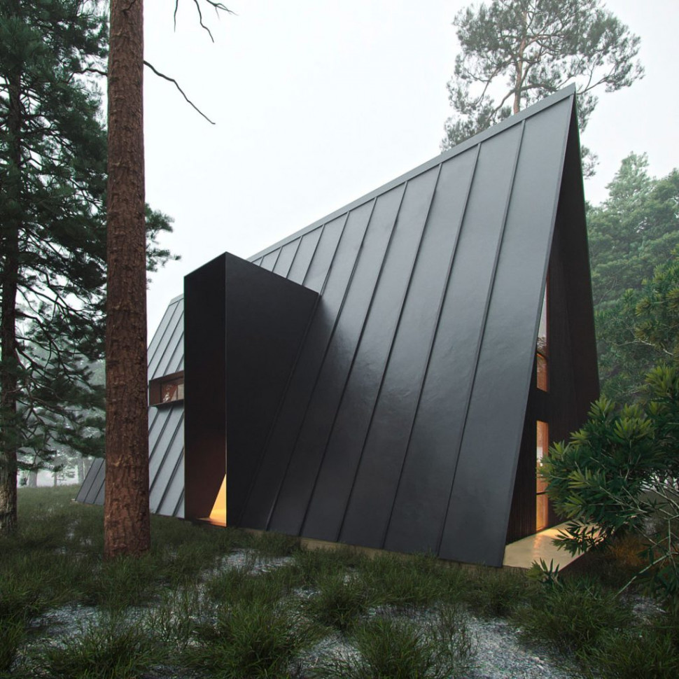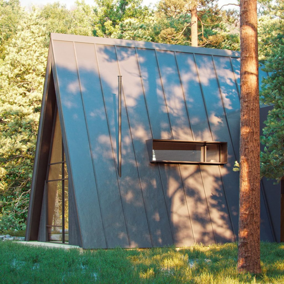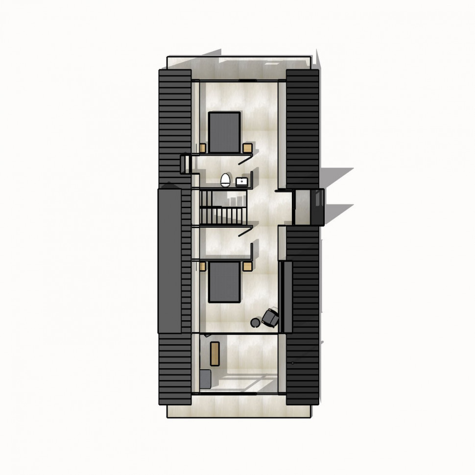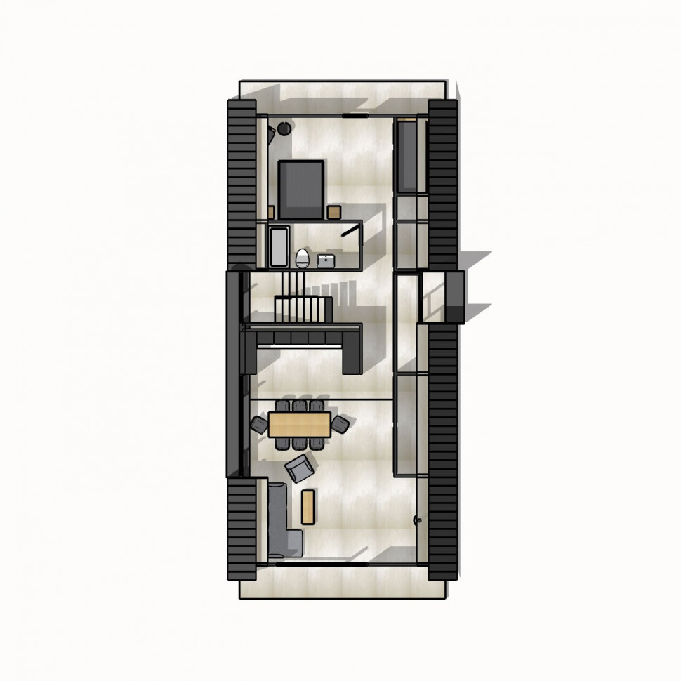 Дом имеет два этажа с четырьмя жилыми комнатами. На первом этаже расположены гостиная, кухня, спальная комната и санузел. На втором мансардном этаже еще две спальни и второй санузел. Панорамные окна придают дому современный вид, и создают ощущение еще большего пространства.