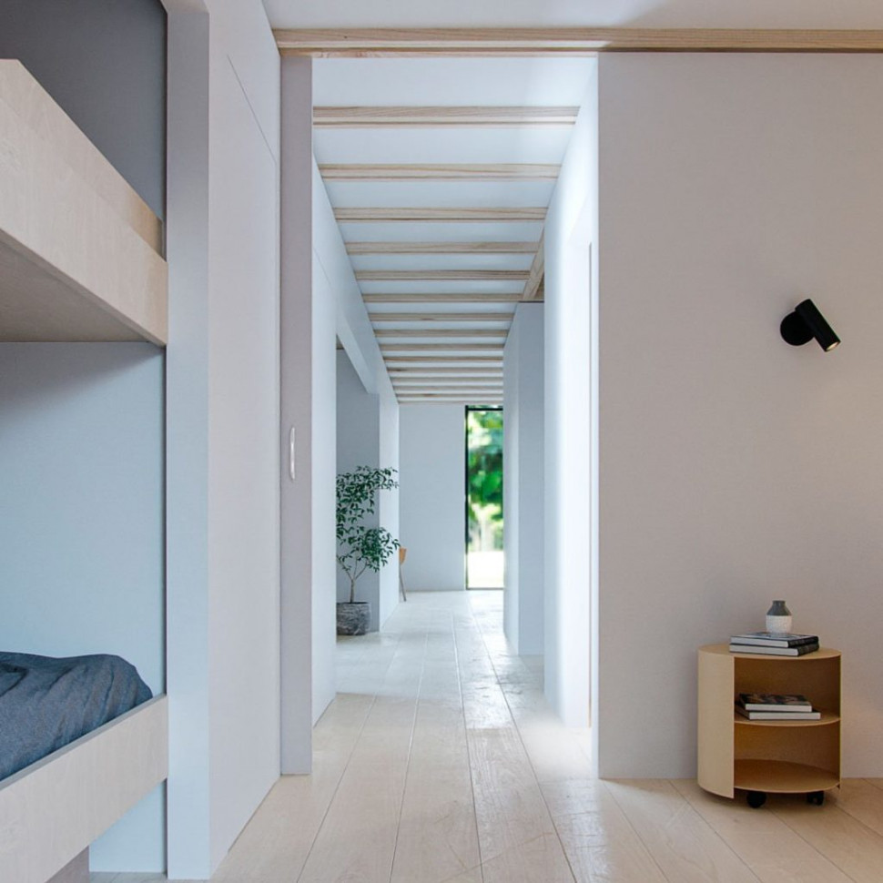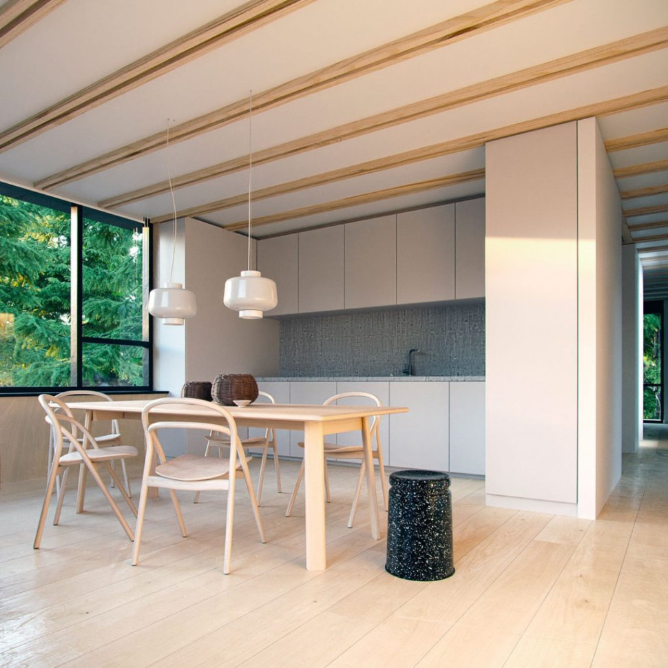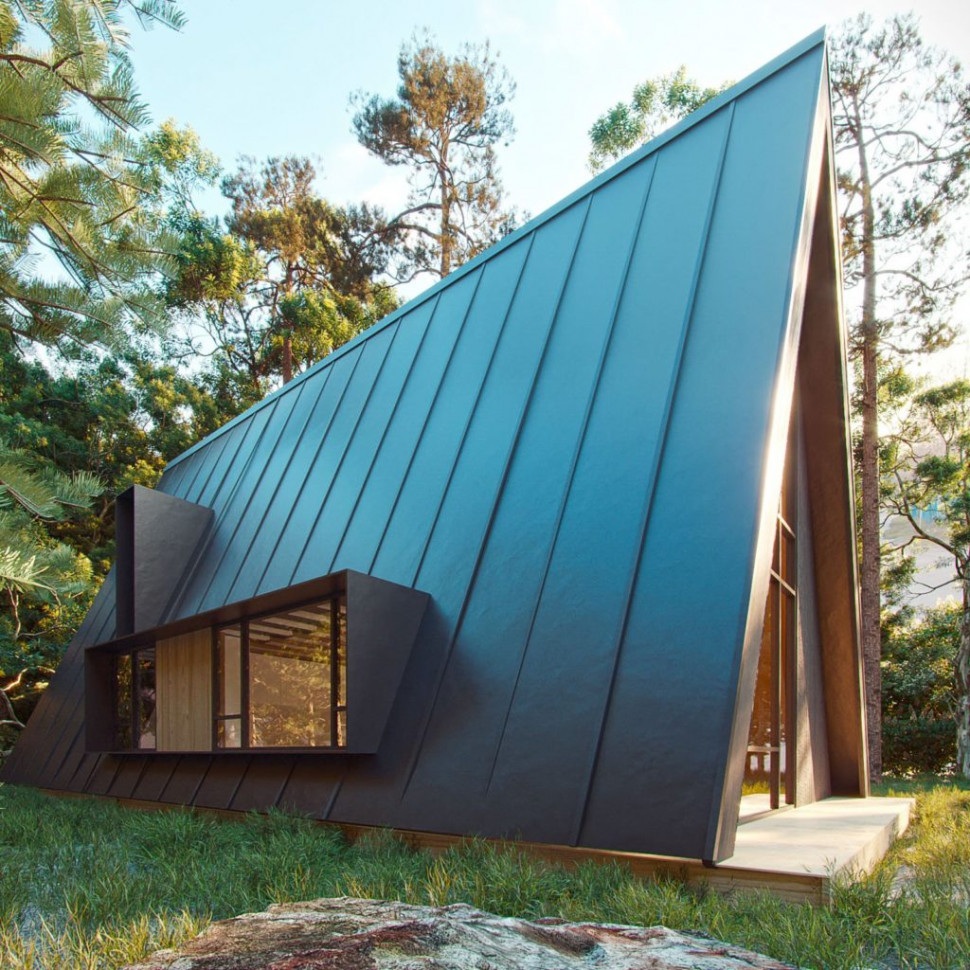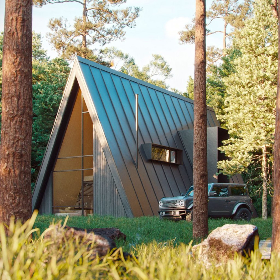 Дом имеет два этажа с четырьмя жилыми комнатами. На первом этаже расположены гостиная, кухня, спальная комната и санузел. На втором мансардном этаже еще две спальни и второй санузел. Панорамные окна придают дому современный вид, и создают ощущение еще большего пространства.