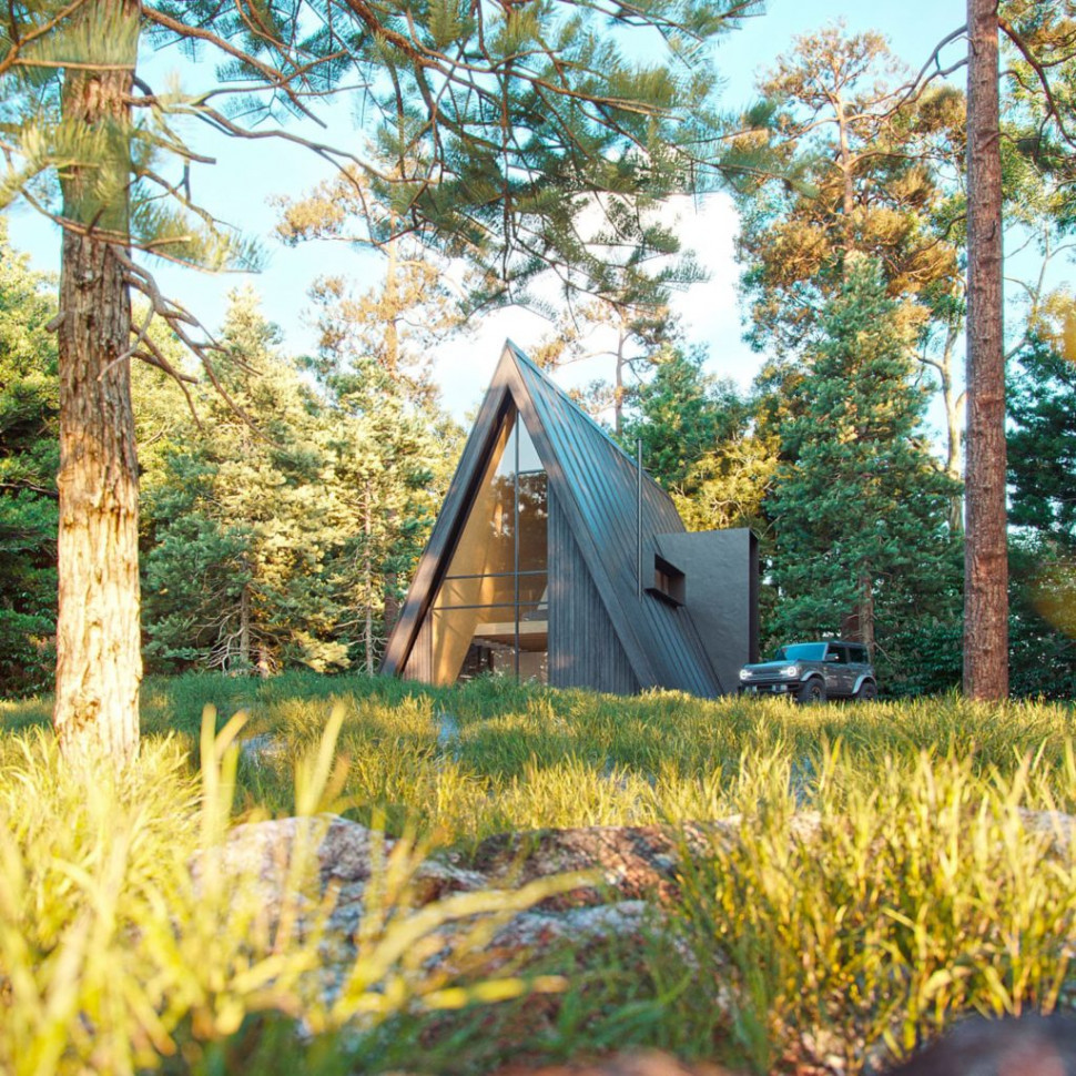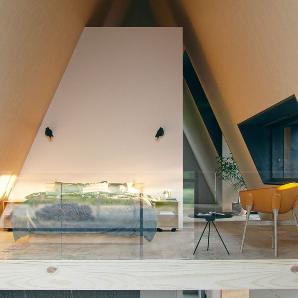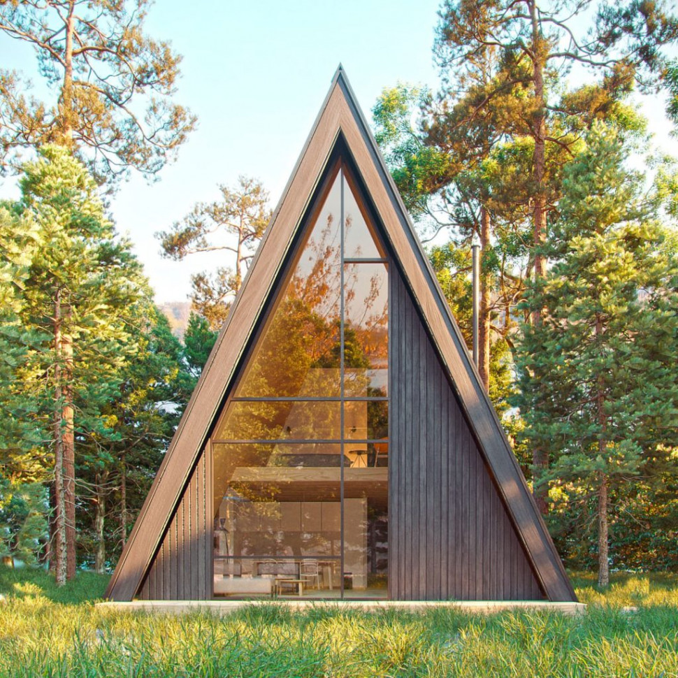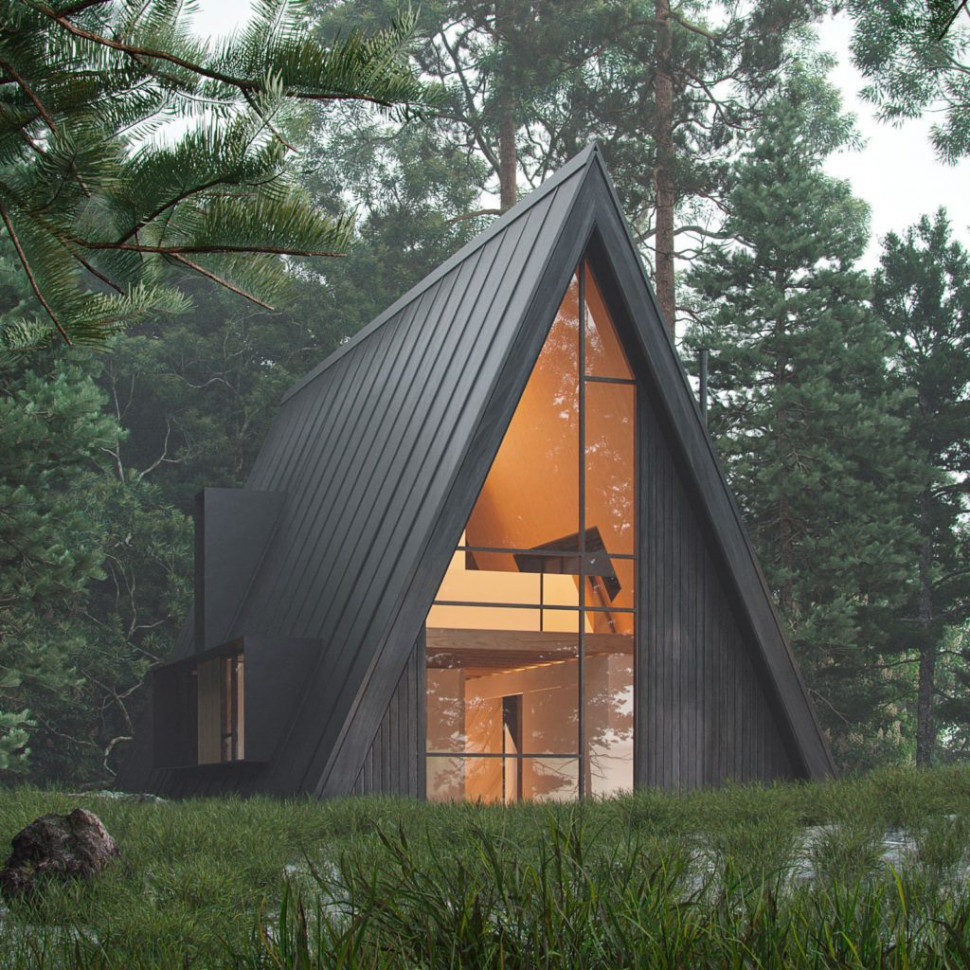 Проект двухэтажного A-frame дома. Габариты 22 на 9 метров, площадь, 200 кв. м, 4 жилые комнаты.