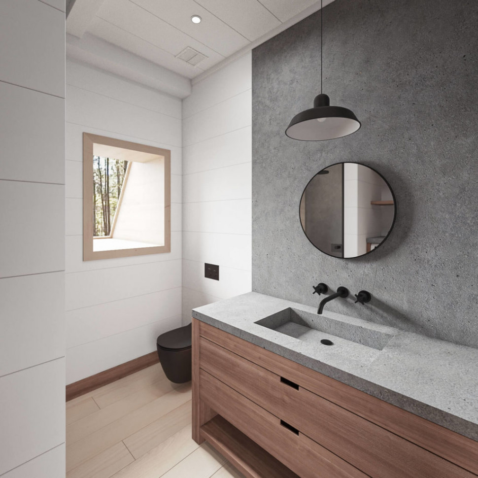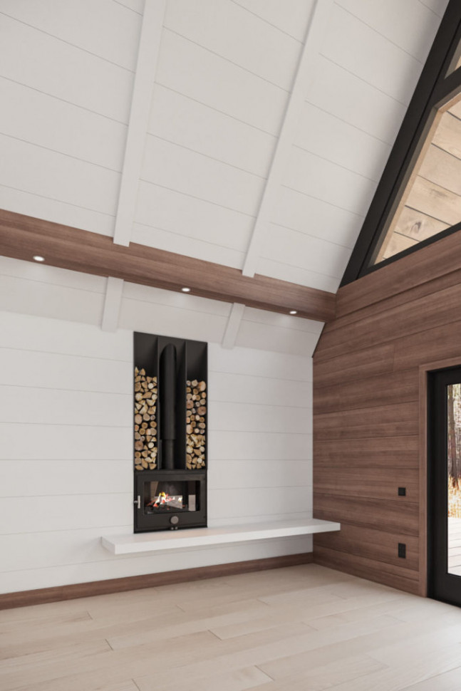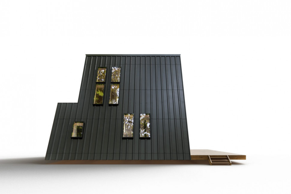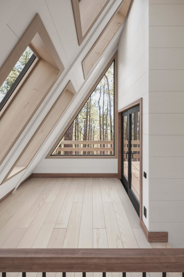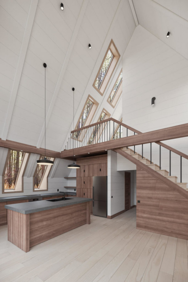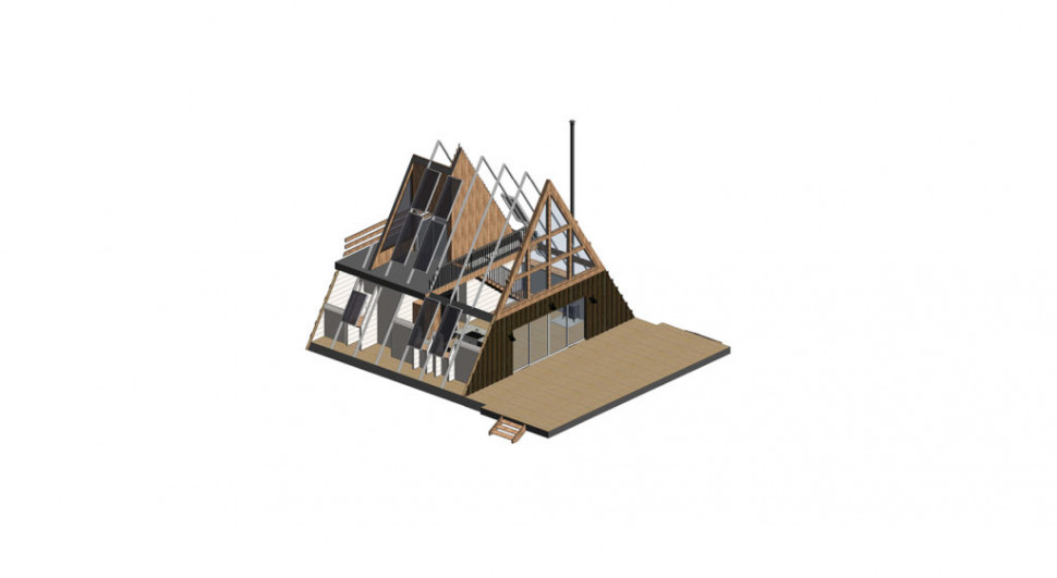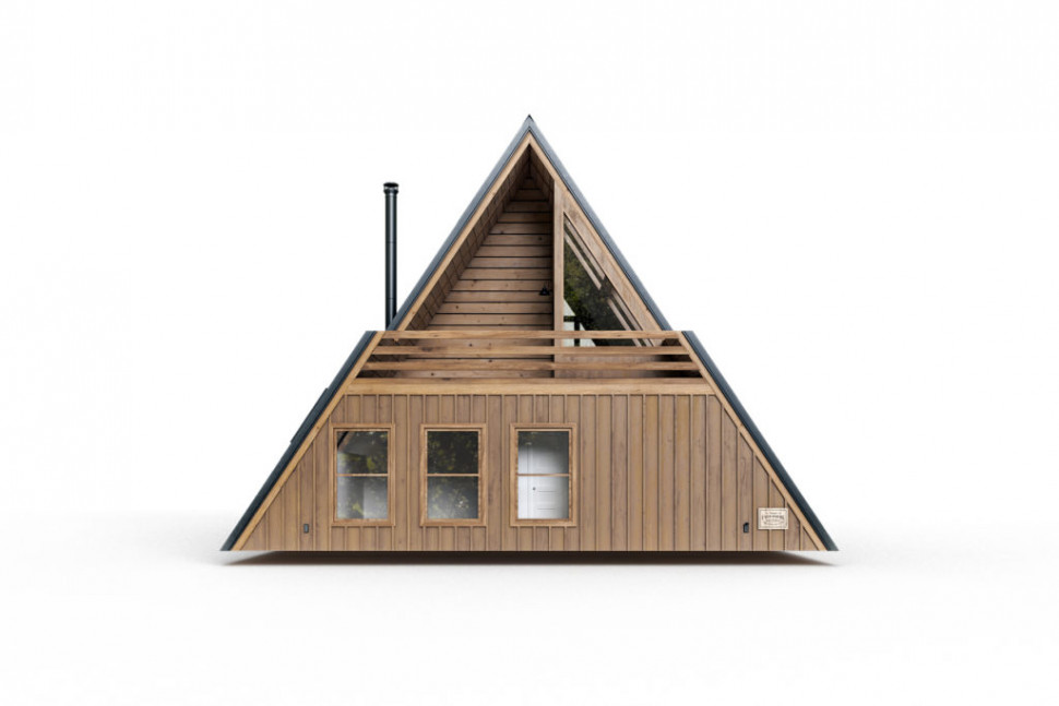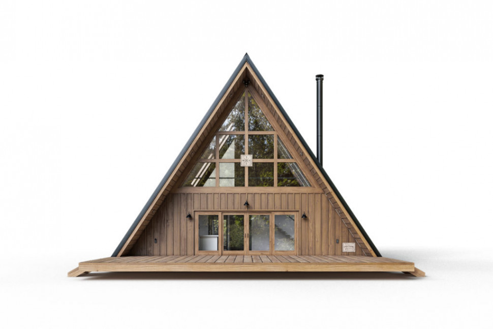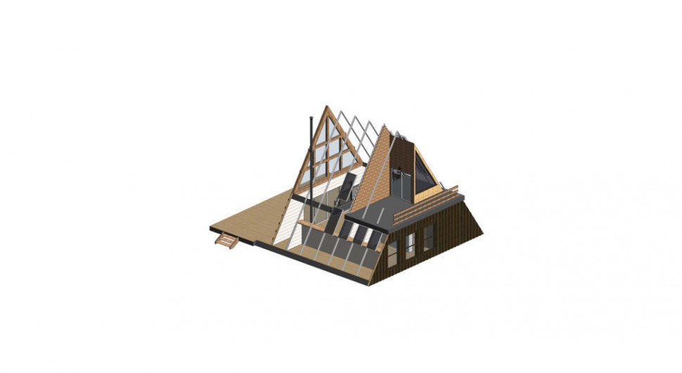 Проект двухэтажного A-Frame 9 на 7 метра, 76 м. кв. полезной площади, с двумя открытыми террасами, на первом этаже перед фасадом, и на втором. Три комнаты. На первом этаже довольно просторная гостиная, объединенная с кухней, спальная и санитарный узел. И еще одна спальня на втором этаже. Дом очень светлый, фасад выполнен почти полностью под панорамное остекление. Много дополнительных окон в стеновых скатах. Дом рассчитан на комфортное круглогодичное проживание семьи из трех человек. Может служить гостевым домом, дачей, туристическим коттеджем.