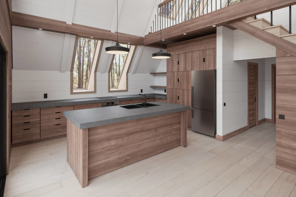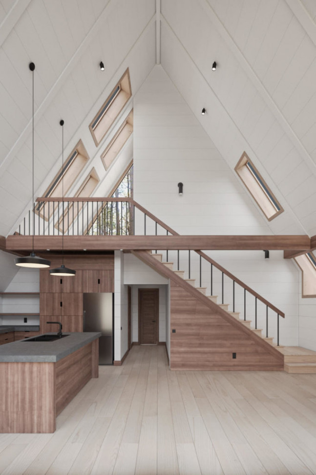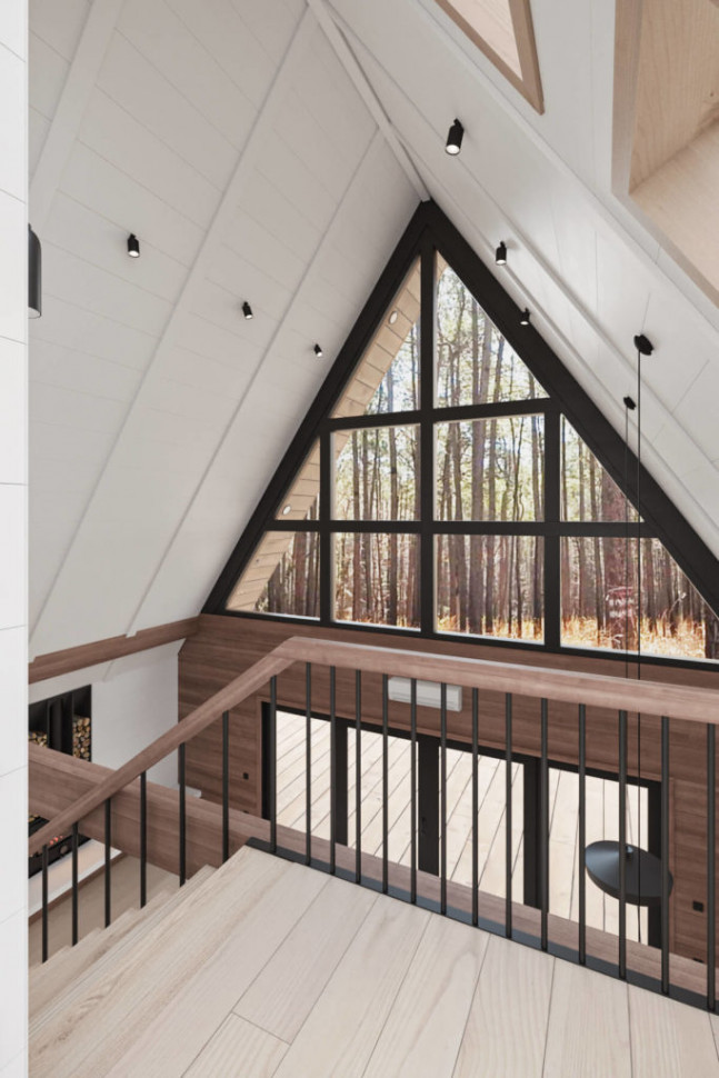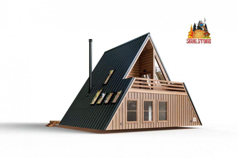 Проект A-frame дома два уровня. Габариты 9 на 7 метров, площадь 76 кв. м.