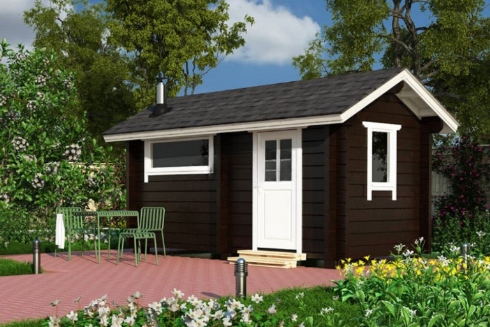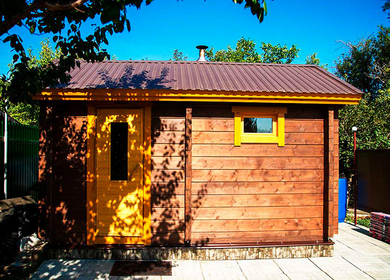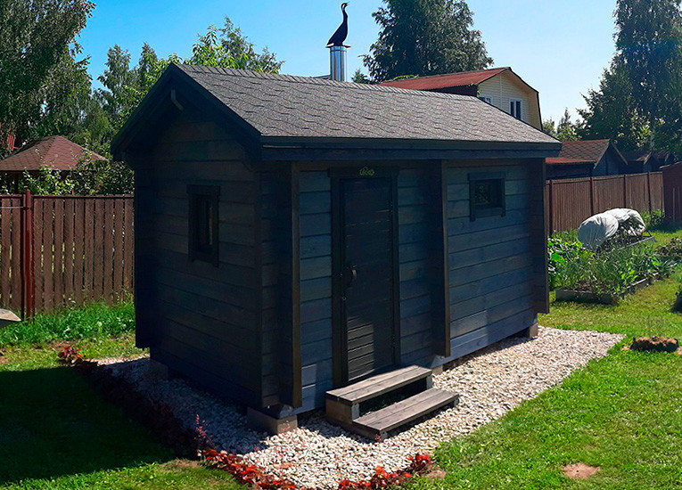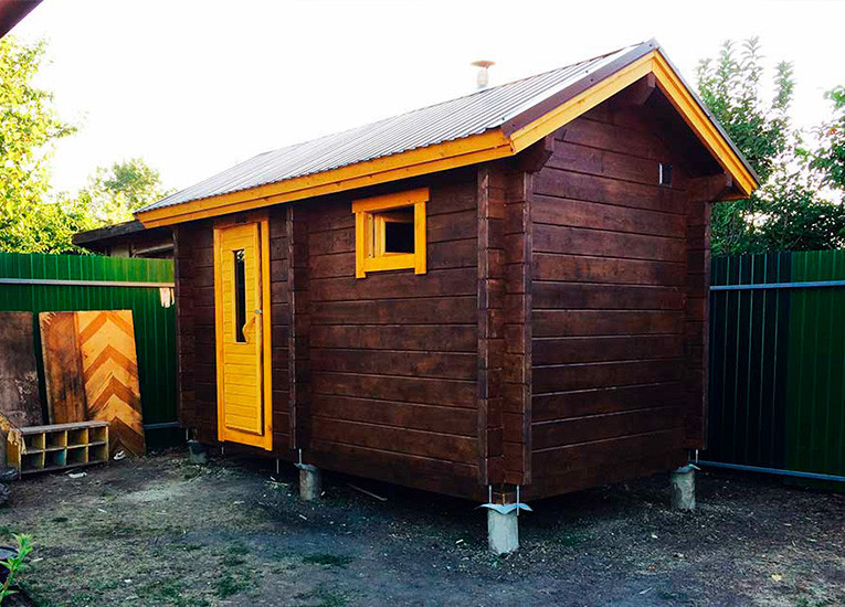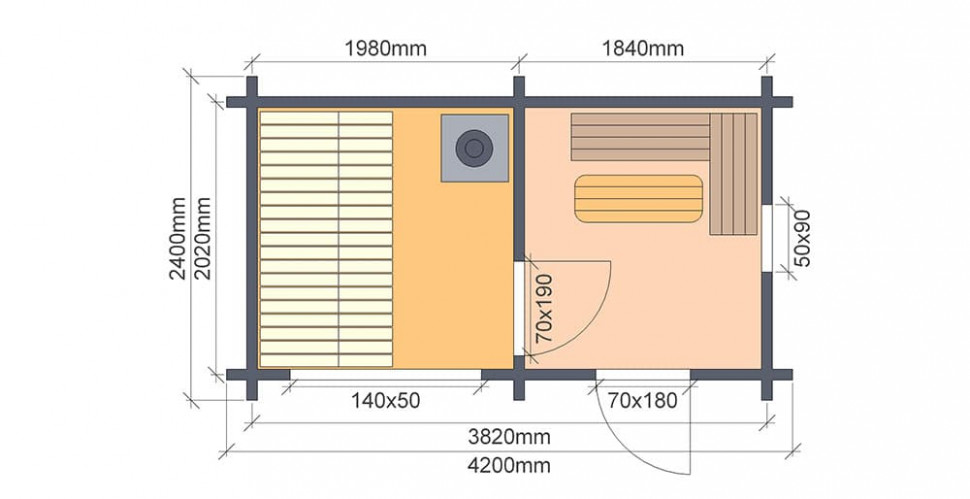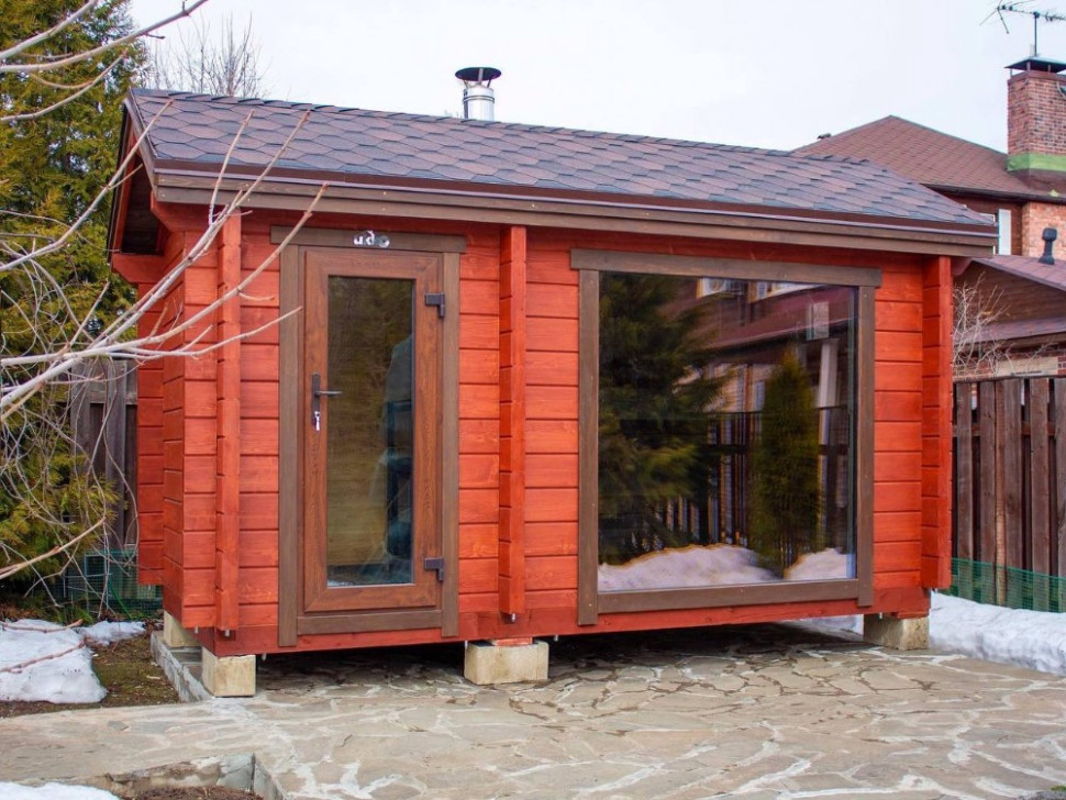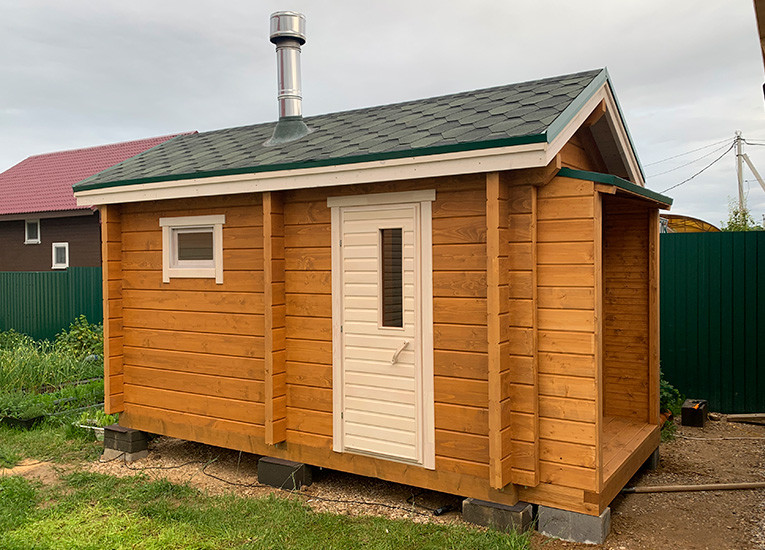 Проект мини бани 4 на 2 м, с двумя отделениями: парная 2х2 м (4 м2) и предбанник 1,8х2 (3,6 м2). Главное достоинство бани – возможность доставки и установки в уже собранном виде, на легкий блочный фундамент, т.е. буквально за несколько часов. На участке практически любого, даже самого небольшого размера.