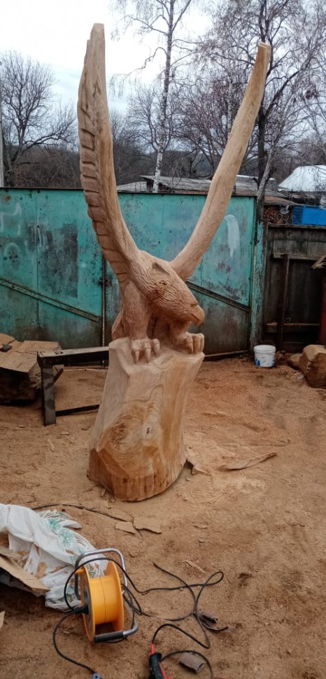 Детализированная цветная скульптура орла на высоком постаменте. Выполнена из дерева. Подойдёт для размещения в садово-парковой зоне или украшения коммерческой недвижимости с целью привлечения клиентов (охотничьего клуба, зоны отдыха и т. д.).