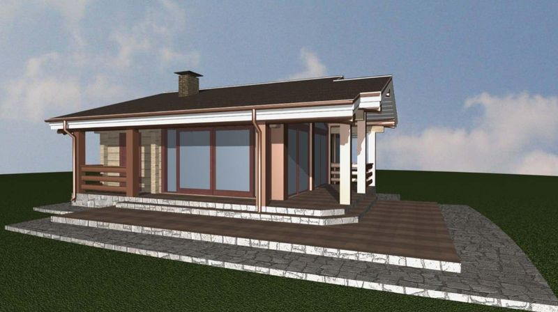 Одноэтажная деревянная баня с панорамным остеклением. Основным строительным материалом для реализации проектного решения является лафет. Постройка имеет размеры 10,86 х 7,24 метра. Общая площадь бани составляет 86,8 м2, из которых 58,2 м2 отведено под внутренние помещения и 28,6 м2 на террасу. Внутри постройки присутствуют все необходимые для полноценного отдыха функциональные зоны — парилка, душевая комната, санузел, хамам, предбанник, тамбур и комната отдыха. Витражные окна, являющиеся изюминкой данного проектного решения, органично вписываются в стилистику постройки и обеспечивают ей достаточное количество света круглый год. Открытая терраса отлично подходит для летнего отдыха в широком семейном кругу или в кругу друзей.