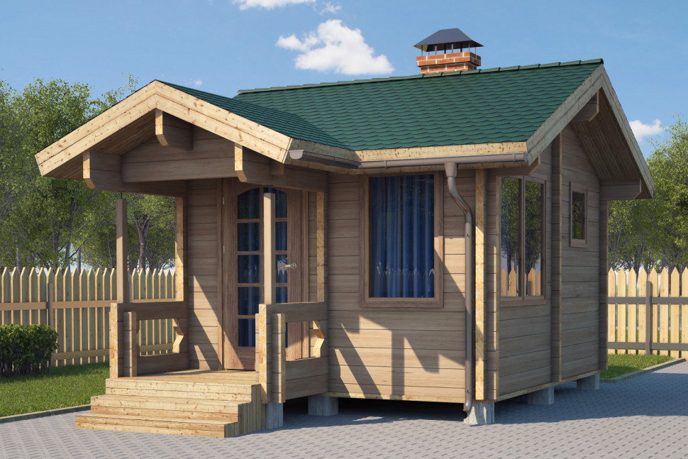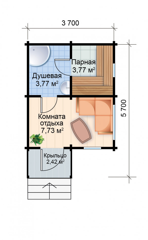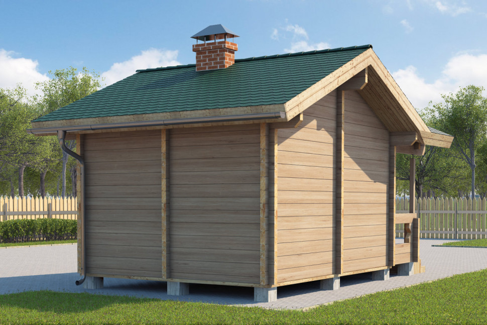 Общая площадь строения составляет 19 м2, из которых 3 м2 приходится на крыльцо-террасу и 16 м2 на саму баню.