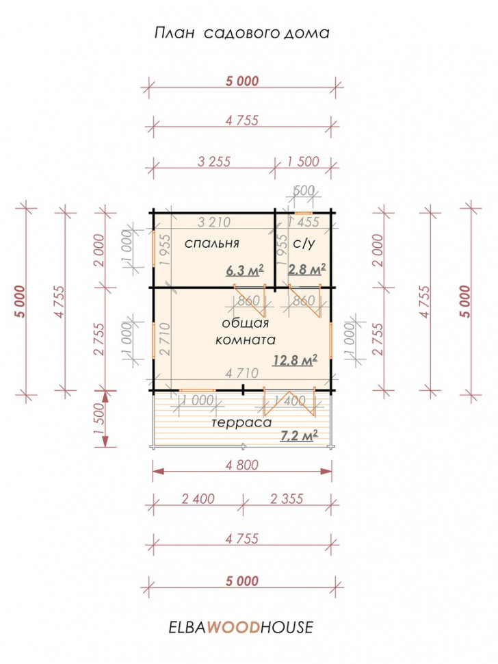 Главными достоинствами уютных садовых домиков из минибруса являются компактность, функциональность и надежность. Типовой проект постройки размером 6.5х5 м предусматривает наличие террасы, общей комнаты, спальни и санузла. Домик площадью 12,8 кв. м является идеальным решением для сезонного проживания на дачном участке.