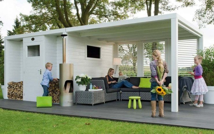 Стильно оформленный садовый домик из минибруса с просторной открытой террасой гармонично впишется в любой ландшафтный дизайн, позволит преобразить дачный или приусадебный участок. Постройка площадью 8,2 кв. м имеет открытую зону для отдыха и помещение с нишами для хранения дров или инвентаря. Терраса оснащена навесом, с одной стороны имеет полупрозрачную перегородку.