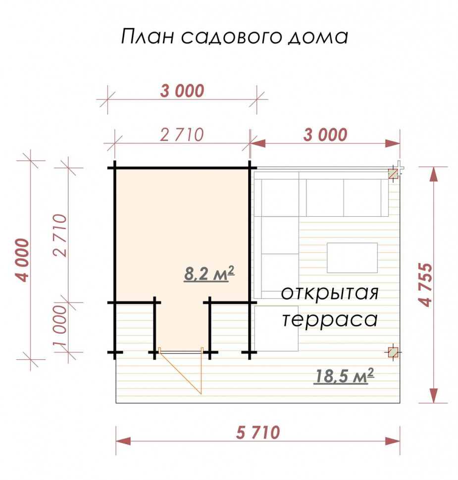Минибрус является экологичным натуральным материалом, который не требует дорогостоящей отделки и не дает усадку. Садовый домик размером 5.7х4 м сочетает превосходное качество и доступную цену, отличается легкостью и высокой скоростью монтажа. В типовой проект могут вноситься изменения с учетом индивидуальных пожеланий заказчика.