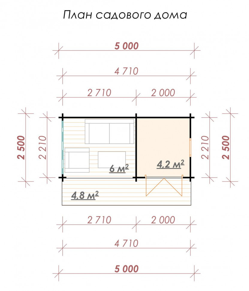 Благодаря применению мини-бруса легкий маленький садовый домик 5 х 2,5 м (4,2 кв м) с террасой можно поставить за считанные дни на легком блочном фундаменте. В процессе монтажа достаточно обработать деревянные элементы антисептическими пропитками или покрасить, чтобы уютный домик прослужил многие годы.