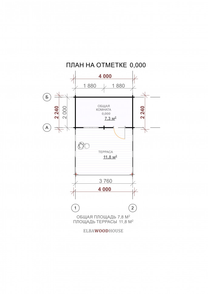 Садовый домик с наружной террасой станет недорогим вариантом для различных хозяйственно-бытовых целей. Проектом предусмотрено одноэтажное строение длиной 5 м, шириной 4 м. Площадь помещения составляет 7,8 кв. м, открытой площадки – 11,8 кв. м.