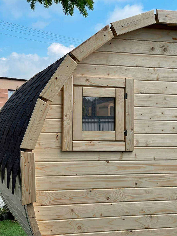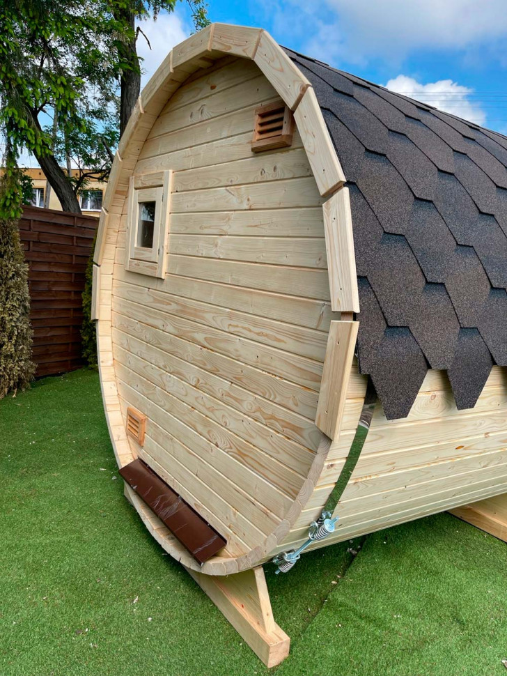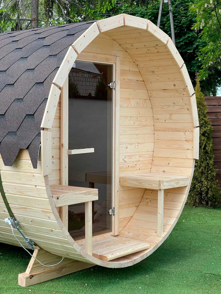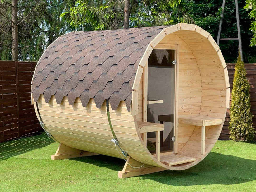 Сауна бочка круглой формы, длинна 250 см, диаметр - 215 см, с одной камерой – парилкой. Снаружи оборудована мини-крыльцом с двумя лавочками. Входная дверь под тонированное стекло. Основной материал – профилированный брус 44 мм толщиной, из ели, сосны или кедра по вашему выбору. Наружная отделка прозрачная, с сохранением натурального цвета древесины, но можно использовать тонировку. Сверху покрытие из мягкой черепицы. Устанавливается на две деревянные подставки.