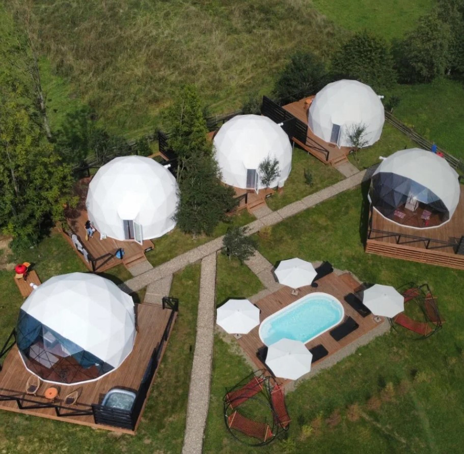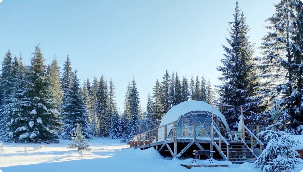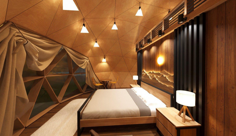 Проект всесезонного сферического глэмпинга с панорамным окном и всеми удобствами Предназначен для организации круглогодичных глэмпингов и экоотелей. Подходит для эксплуатации в зонах с высокими и низкими температурами. Два базовых диаметра: 6,3 м и 7 м. Глэмпинг диаметром 6 метров рассчитан на 3 взрослых, либо 2-х взрослых и 2-х детей. Глэмпинг диаметром 7 метров вместит до 4 взрослых или до 2 взрослых и 3 детей.