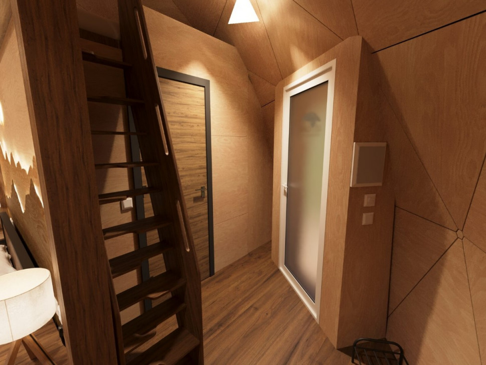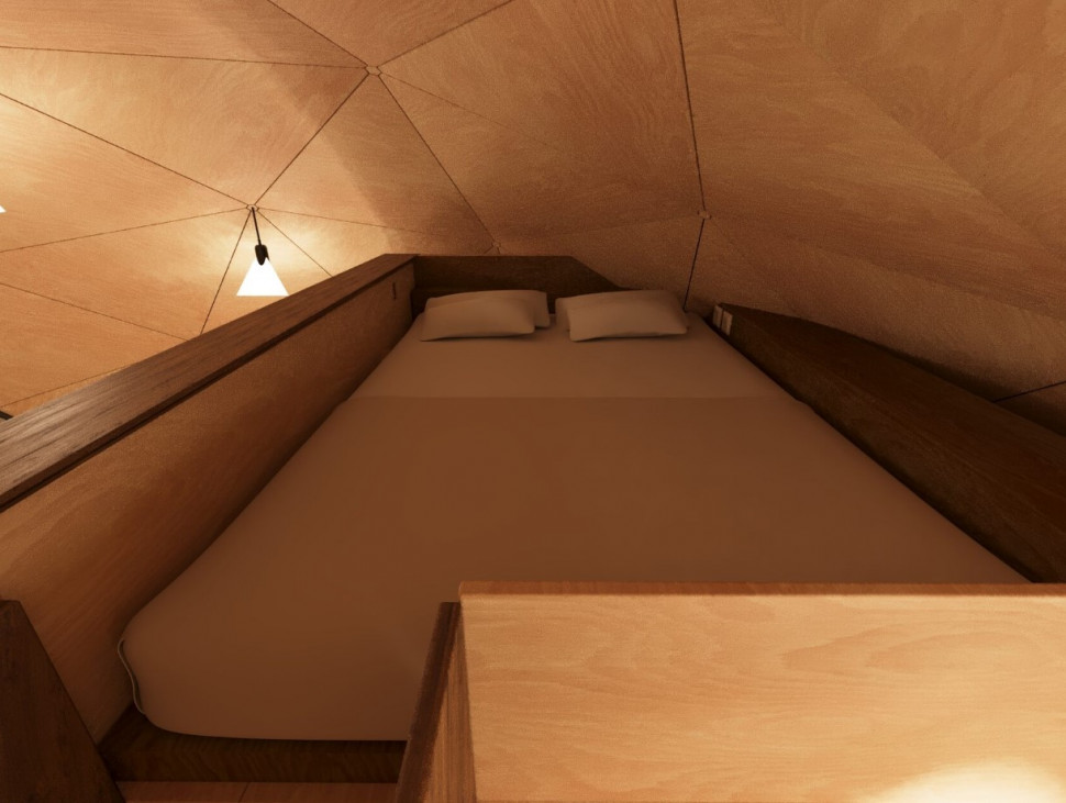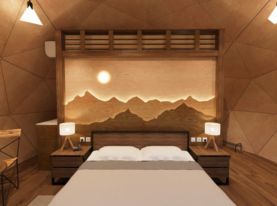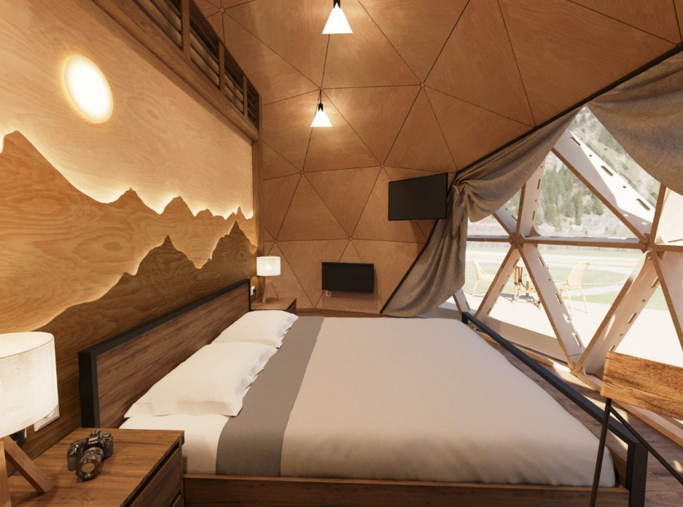 Каркас из высокопрочной фанеры толщиной 18 мм. Конструкция прочнее, чем металлическая Внешний тент из архитектурной ПВХ мембраны белого цвета. Не боится жары и холода Внутренняя обшивка из декоративной фанеры 4 мм. Возможности по индивидуализации интерьера Утеплитель холлофайбер 100 или 150 мм позволяет с комфортом жить в куполе в любую погоду Внутреннее окно из литого поликарбоната. Отличный обзор без искажений. Сантехнический модуль с дополнительным спальным местом.
