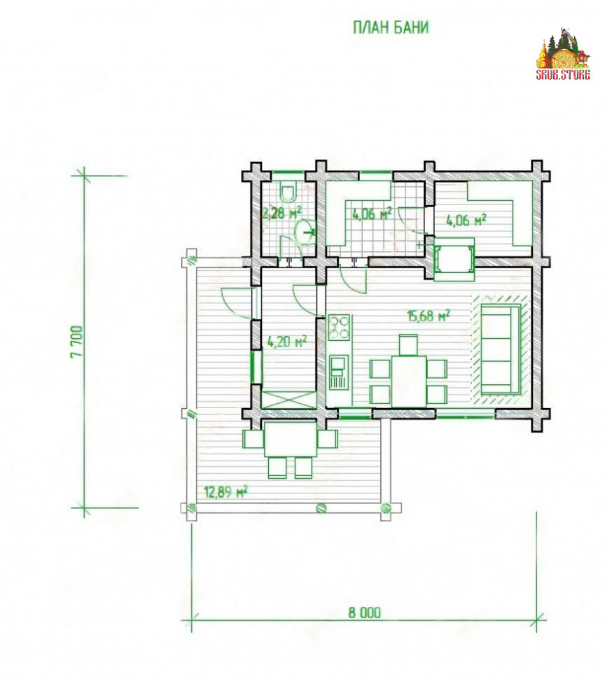 Открытая летняя терраса 13 кв. м Г-образной формы располагается по двум сторонам бани. Вход в баню через тамбур. Внутри парная, раздельный санузел (туалет и помывочная), комната отдыха 15,68 кв. м.