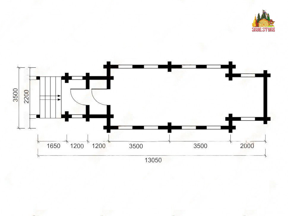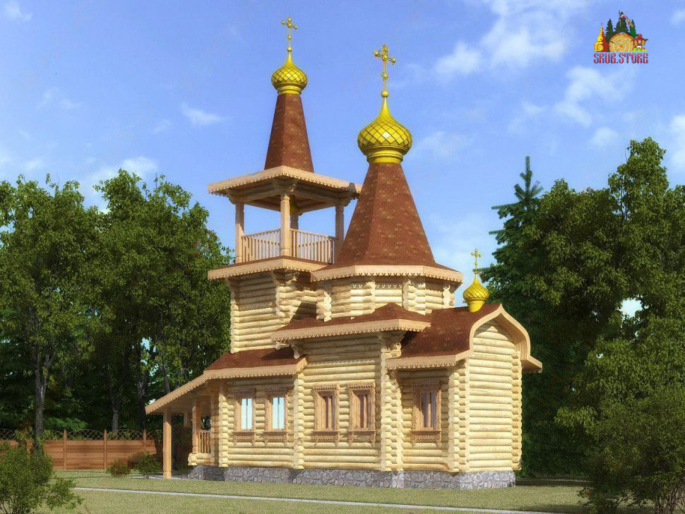 Церковь или часовня 35,5 кв. м, общий размер постройки 13 на 3,5 метра. Стены из оцилиндрованного бревна со светлой естественно отделкой. Кровля кирпичного цвета, маковки – золотые. Выдержана в традициях русского церковного строительства из дерева. Такая церковь или часовня может быть размещена в небольшом поселке, в военной части, или на частном участке, площадь застройки это позволяет. Проект может быть изменен или доработан, до заключения договора и начала подготовки комплекта. Для уточнения деталей пожалуйста обращайтесь к нашему специалисту в онлайн чате, или по телефону +7 (499) 677-52-28.